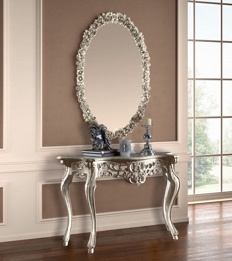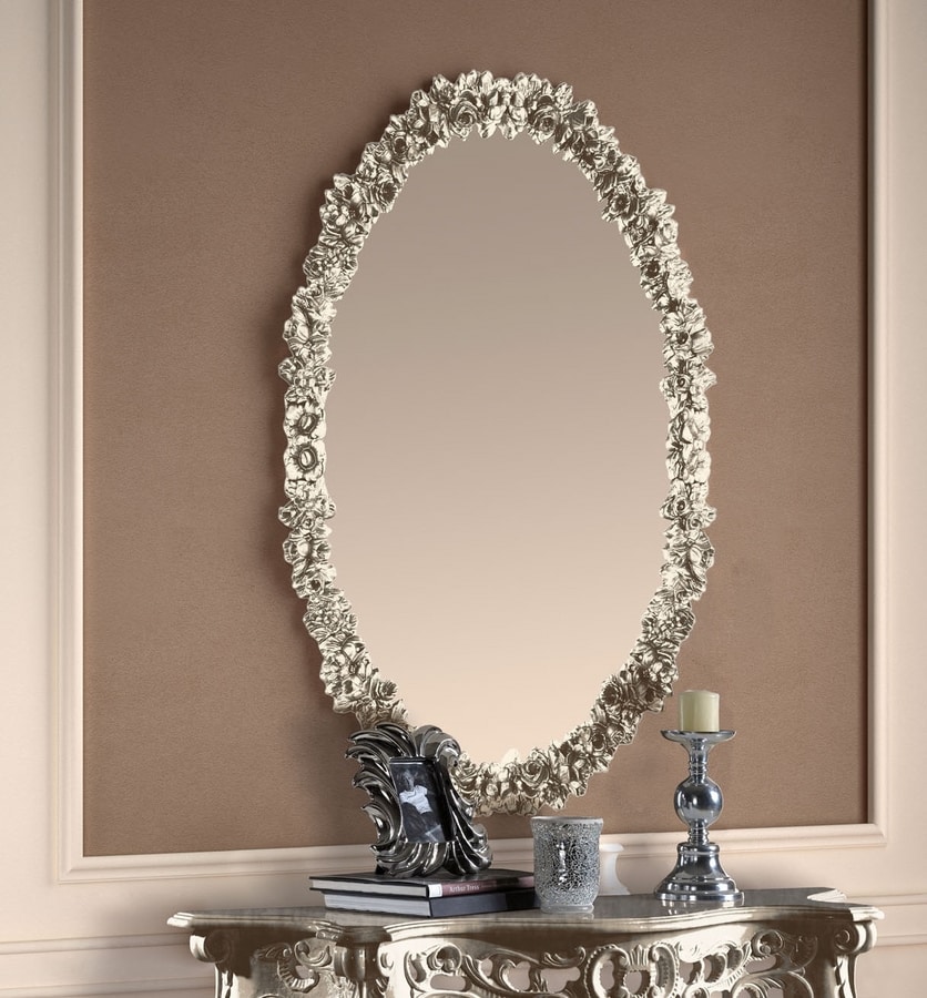 Ovaler Spiegel aus geschnitztem Holz, ganz aus Blattsilber.