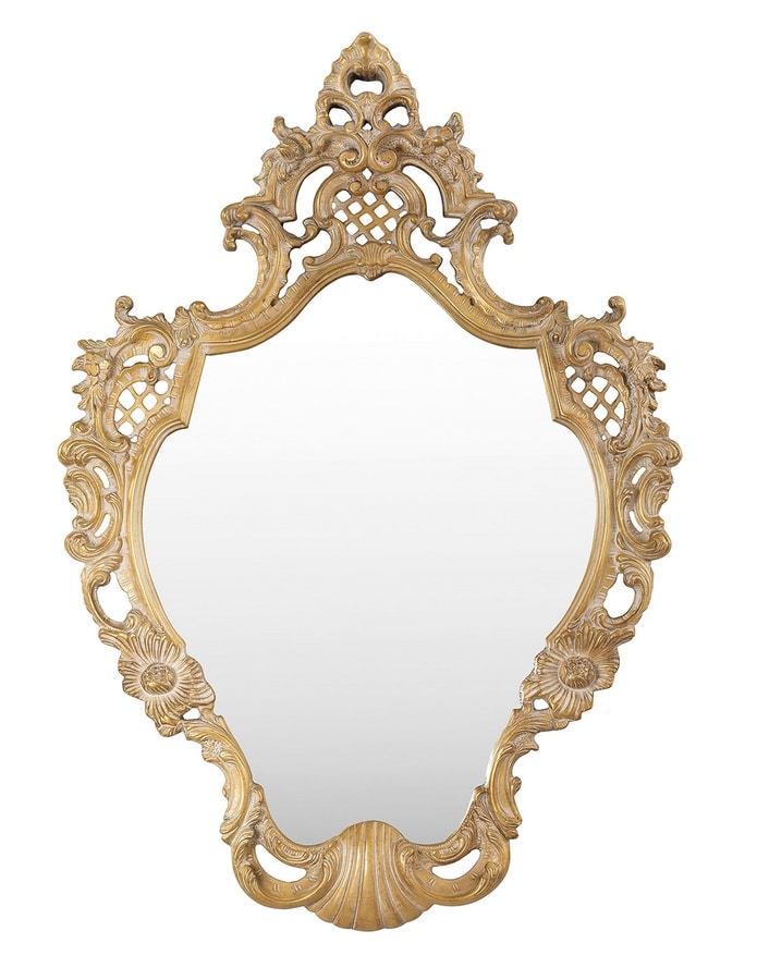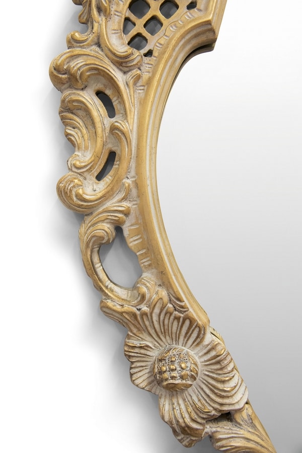 Rahmen aus geschnitztem Holz mit Spiegel, Finish OCH-Blattgold, patiniertes weißes Baiser (Oro Chic)