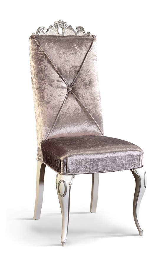 Klassiker Stuhl mit weißen lackierten Beinen mit geschnitzten, verschnitzten Blattdetails. Der Rücken ist auch mit wertvollen Schnitzereien angereichert. Sitzen und Rücken mit Stoff bedeckt.