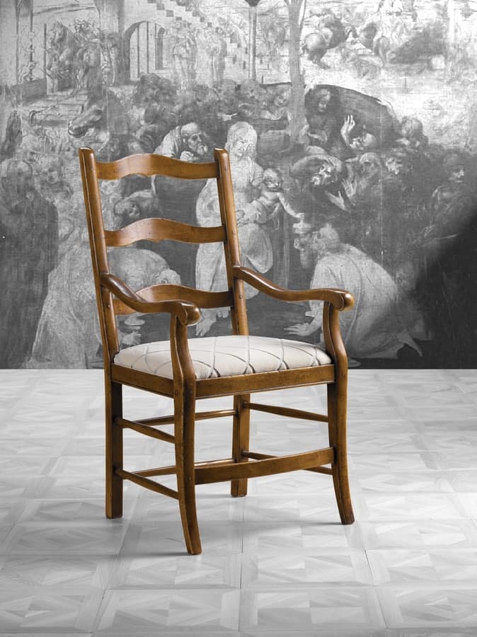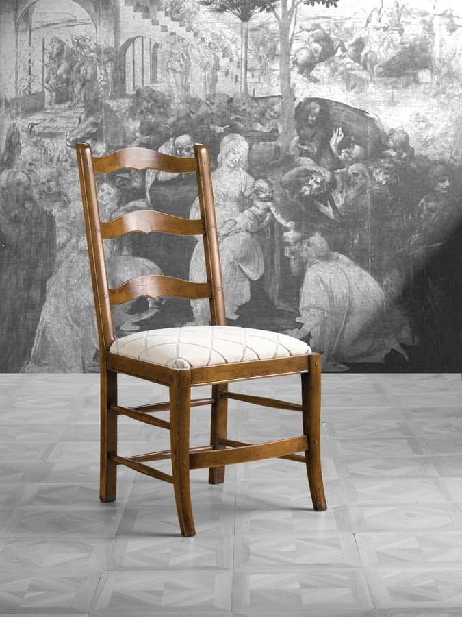 Gefüllter Stuhl für Esszimmer. Holzrahmen, horizontale Lattenroste. Sitz gepolstert mit Stoff. Ideal für klassische Einrichtung. Auch in Ausführung mit Armlehnen erhältlich (Art. 85 / A).