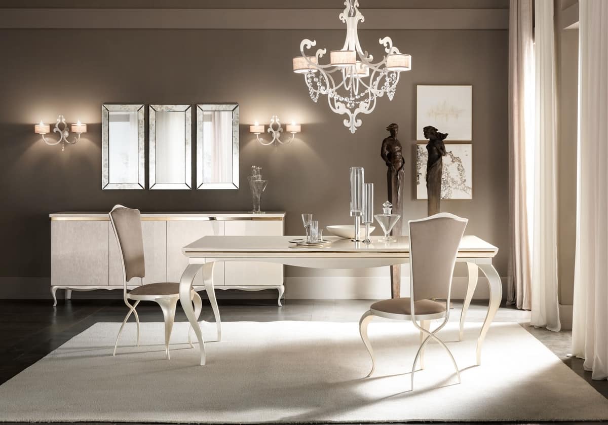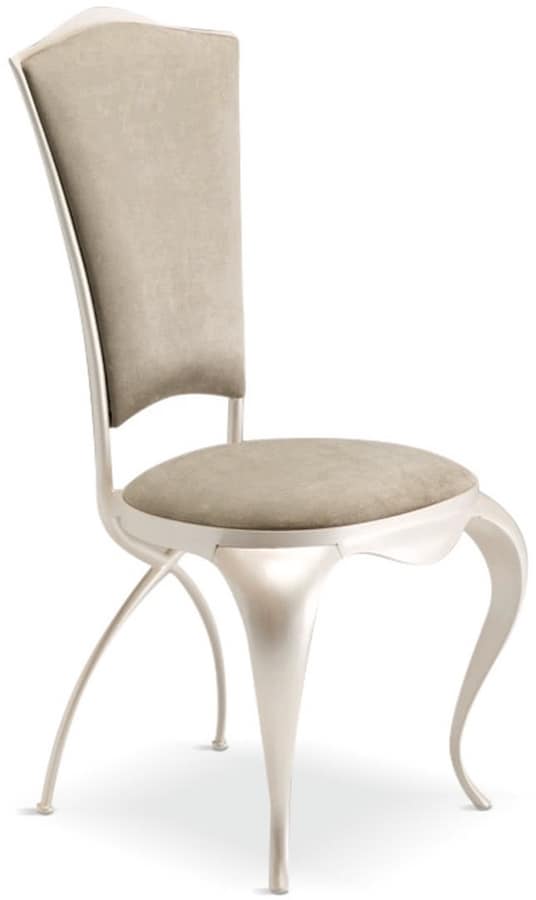 Klassischer gepolsterter Esszimmerstuhl mit Stahlgestell. Gezogener Stahlrahmen mit lasergeschnittenen Elementen, abgerundet im Kaltbiegeverfahren. Die Vorderbeine bestehen aus Aluminiumdruckguss. Die Blattgoldarbeit oder das Perlmuttfinish ist vollständig handgemacht. Sitz und Rückenlehne aus Holz mit Schaumstoffpolsterung und maßgeschneidertem Stoff, Samt, Leder oder Polsterung vom Kunden.