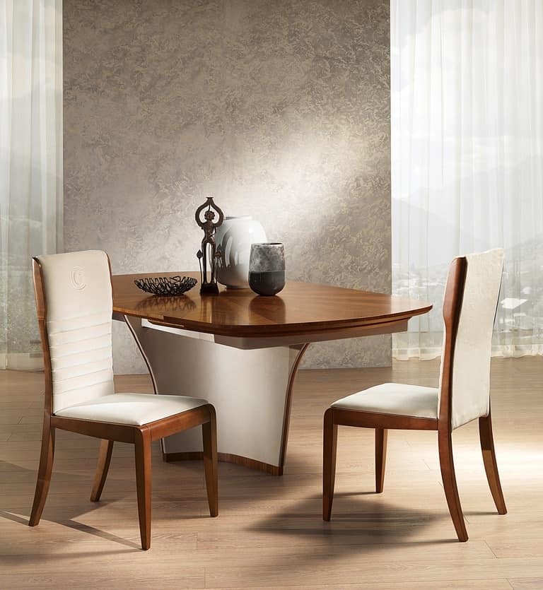 Stuhl mit den Beinen in der Asche aus amerikanischem Nussbaum natur gebeizt, mit Sitz und Rücken gepolstert in Stoff und Leder, in klassischen, zeitgenössischen Stil.