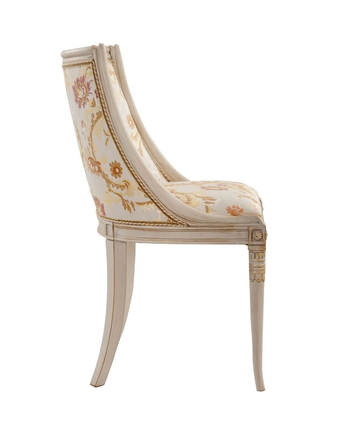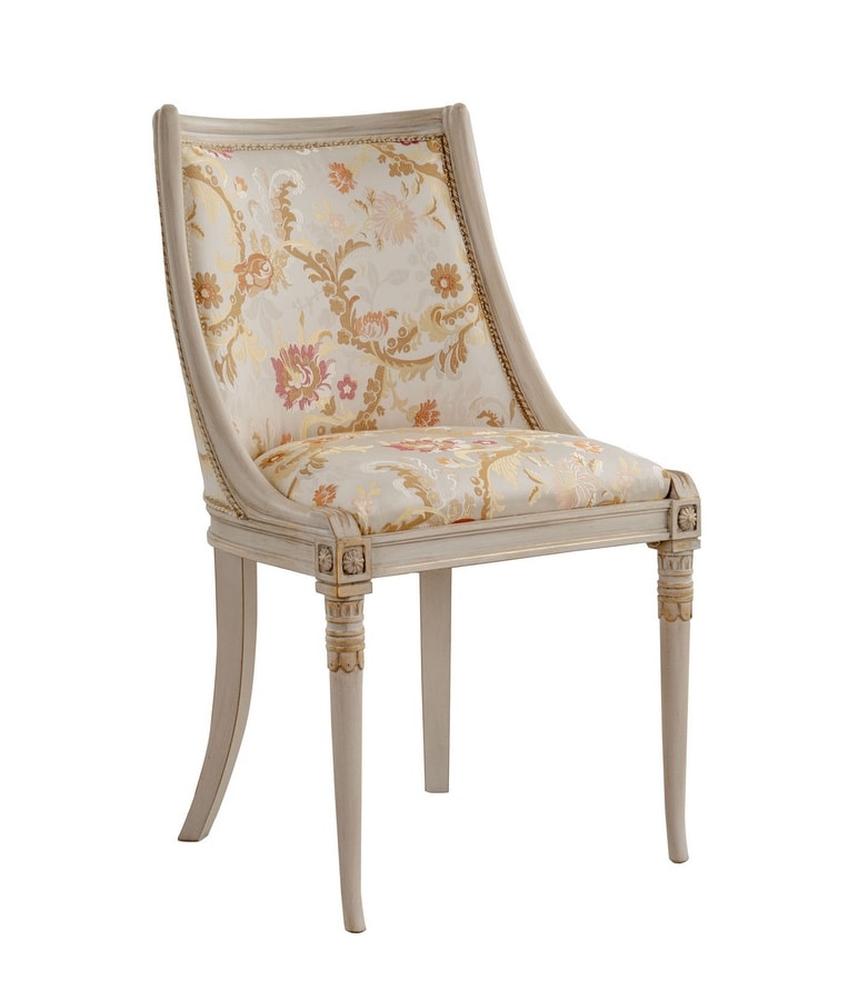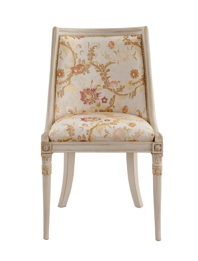 Stuhl aus geschnitztem Holz, mit Stoff gepolstert, Finish LAFM, lackiert in gebürstetem französischem Tempera-Weiß mit Blattgoldbasis. Nicht abnehmbarer Bezug.
