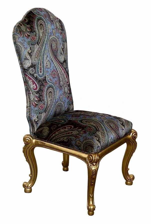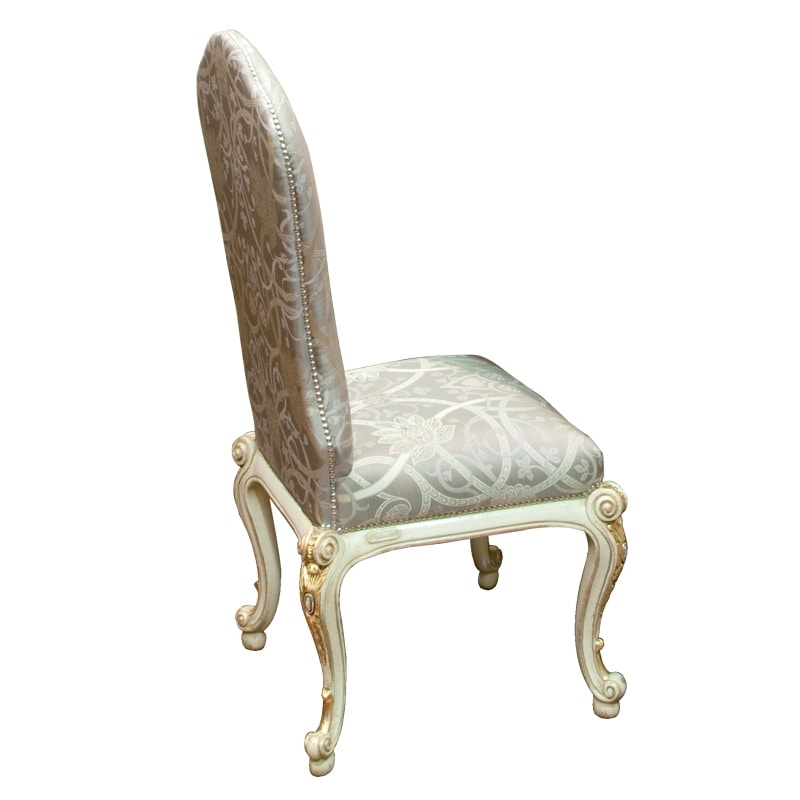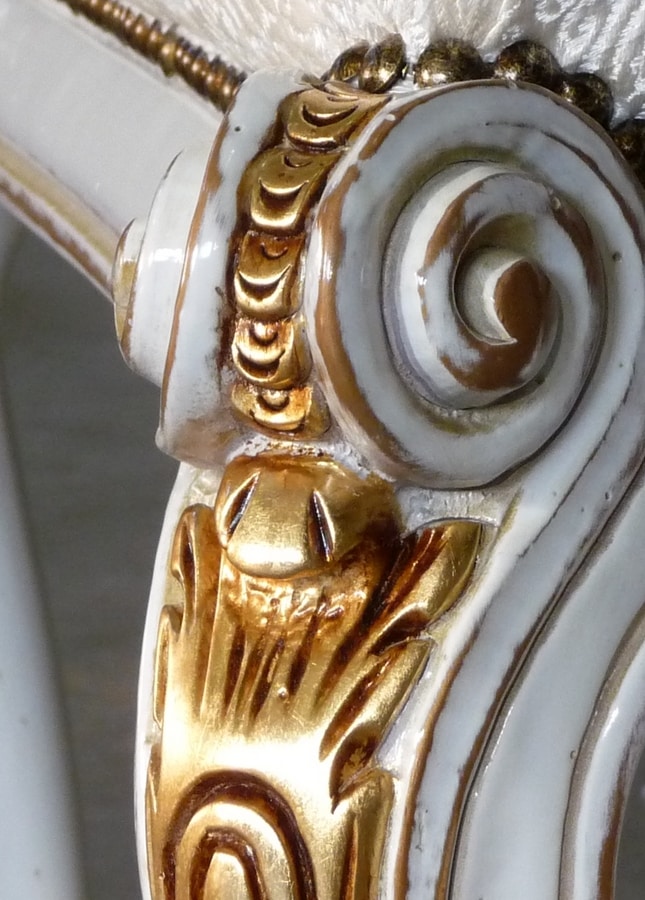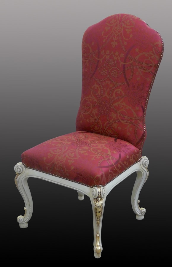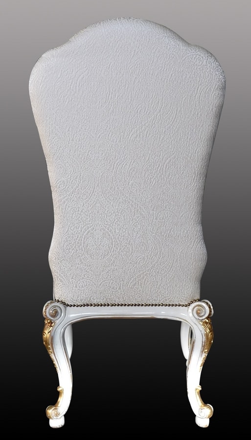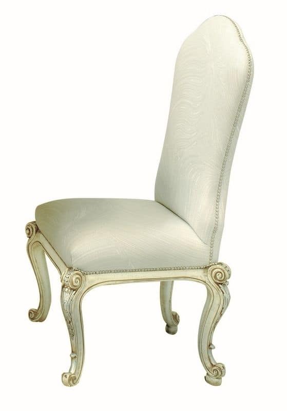 Stuhl mit Sockel mit Schriftrollen und Blumendekorationen, geformter und vollständig gepolsterter Sitz und Rückenlehne mit Metallnieten an den Kanten. Auf dem Foto weiß lackierte Struktur mit Blattgold- und Silberblattdetails und leichtem Stress.