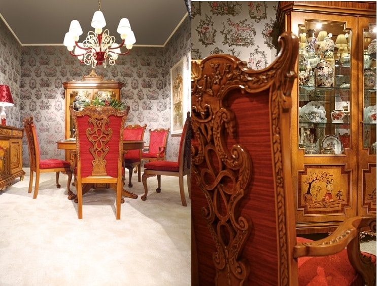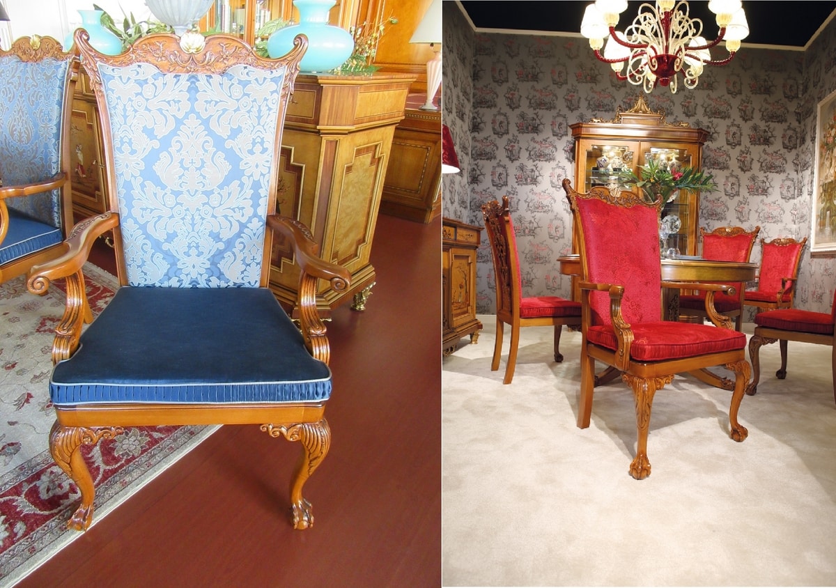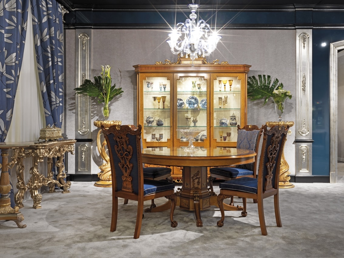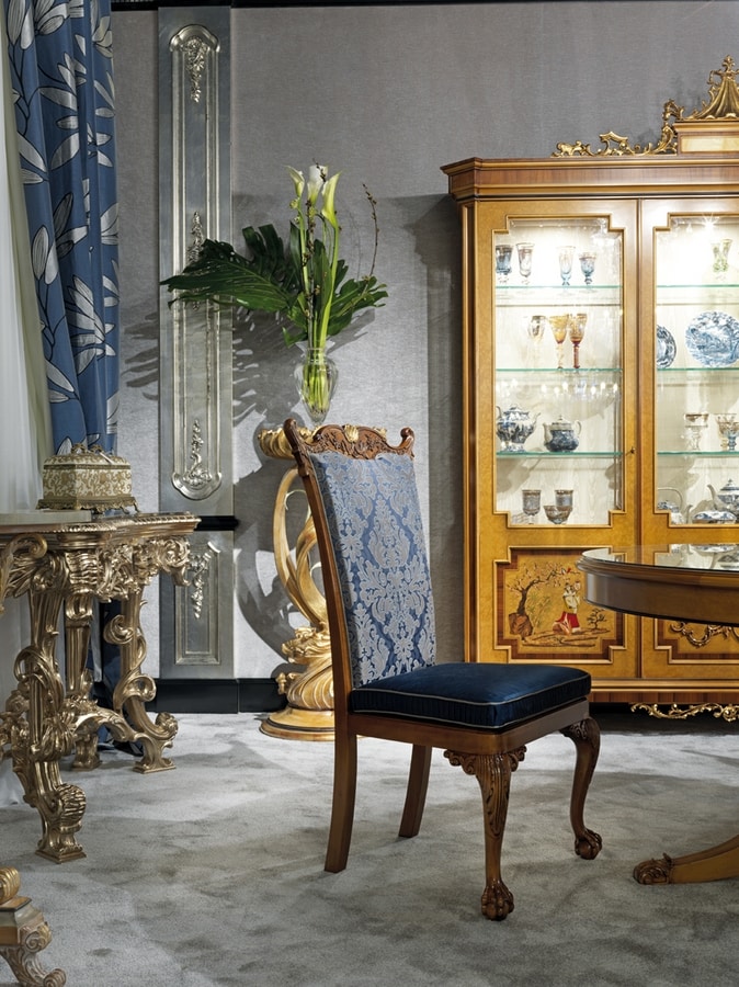 Klassischer Luxusstuhl, chinesische Art. Der Stil wird durch die ausgewählten Stoffe und die wertvollen und aufwendigen Schnitzereien hervorgehoben, die den Rücken charakterisieren. In Kirsche Finish mit Gold begleitet es den Esstisch im gleichen Stil. Erhältlich in verschiedenen Ausführungen und Beschichtungen.