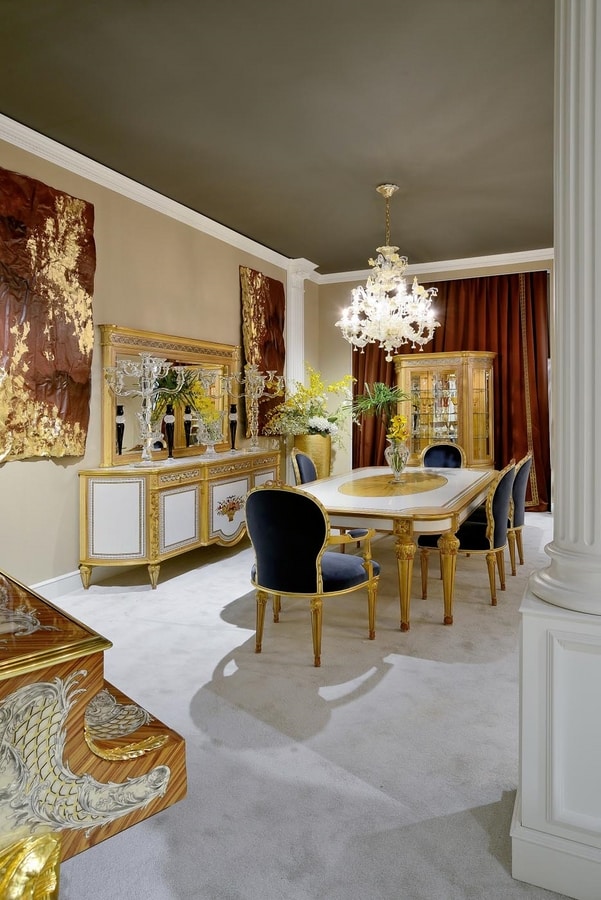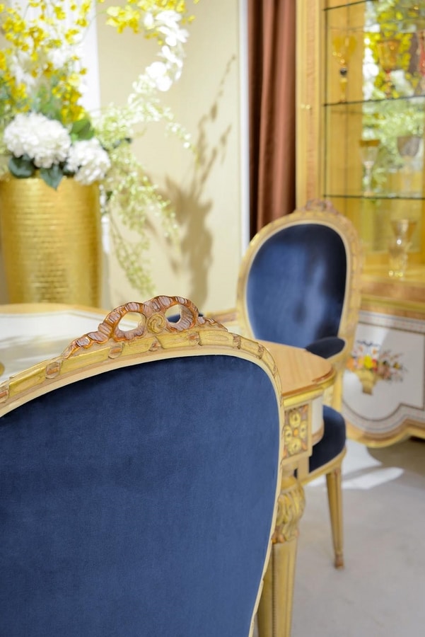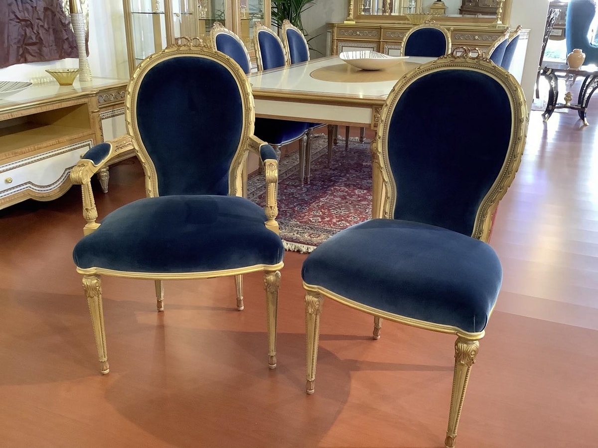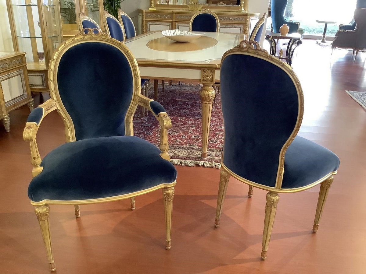 Klassischer Luxusstuhl im Louis XVI-Stil. Das Decapè-Finish ist mit gold- und bronzefarbenen Details angereichert. Made in Italy Samt bedeckt sowohl den Sitz als auch die innere und äußere Rückenlehne. Geeignet für elegante Esszimmer und luxuriöse Esstische in den Schlafzimmern. Die Beachtung von Einzelheiten ist für Ezio Bellotti ein Muss.