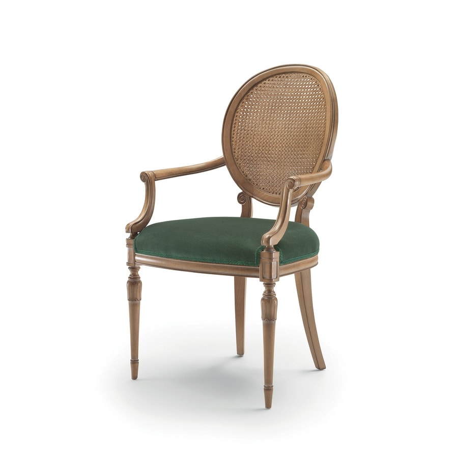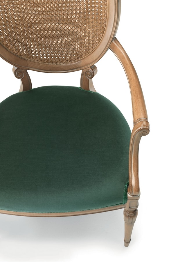 Geschnitzter Stuhl, mit Stoff bezogen, Rückenlehne aus Wienerstroh, Antik-Decapè-Finish.