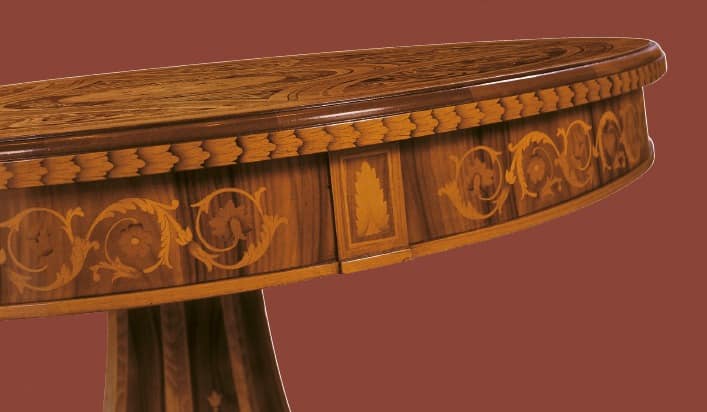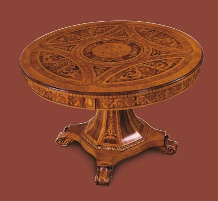 Runder Tisch für klassischen Stil Esszimmer. Luxuriöse Tisch mit Holzstruktur und top entkernt mit Intarsien. Feet Hand geschnitzt. Hergestellt in Italien von spezialisierten Handwerkern.