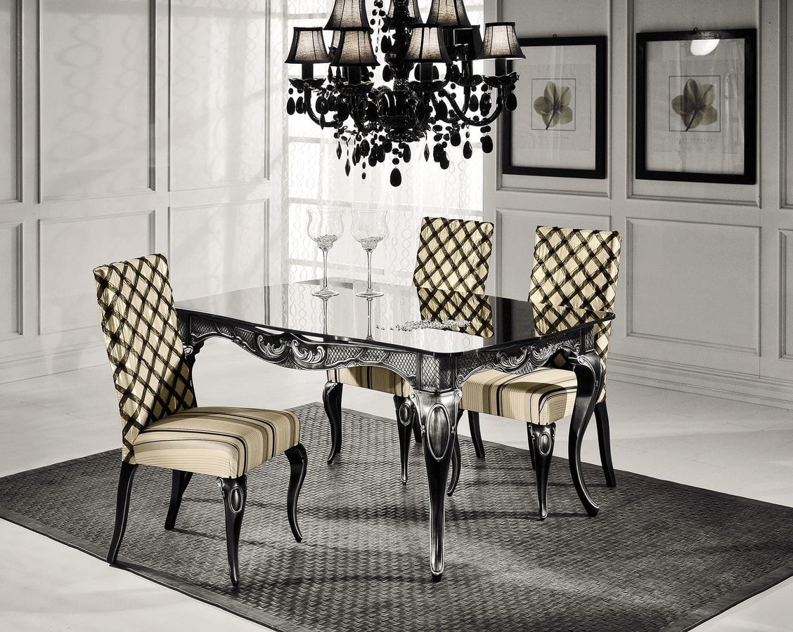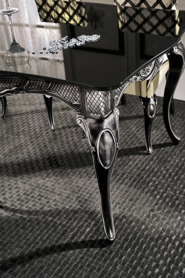 Fester Tisch mit geformter Kristallplatte, lackiert mit silbernen Verzierungen.
