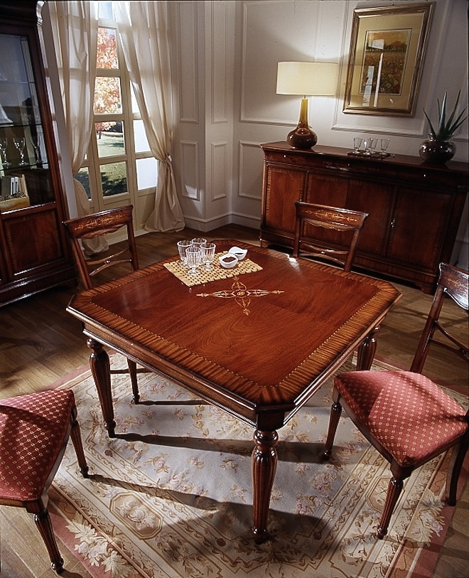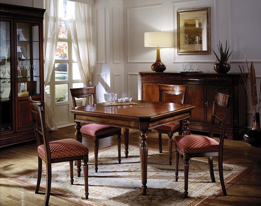 Tisch kombiniert mit 4 handgefertigten Stühlen aus Mahagoni, 100 % Made in Italy. Sitzfläche mit hochwertigem Stoffbezug nach Wahl des Kunden aus unserem Musterbuch, geschnitzte Holzlehne und gedrechselte Beine.