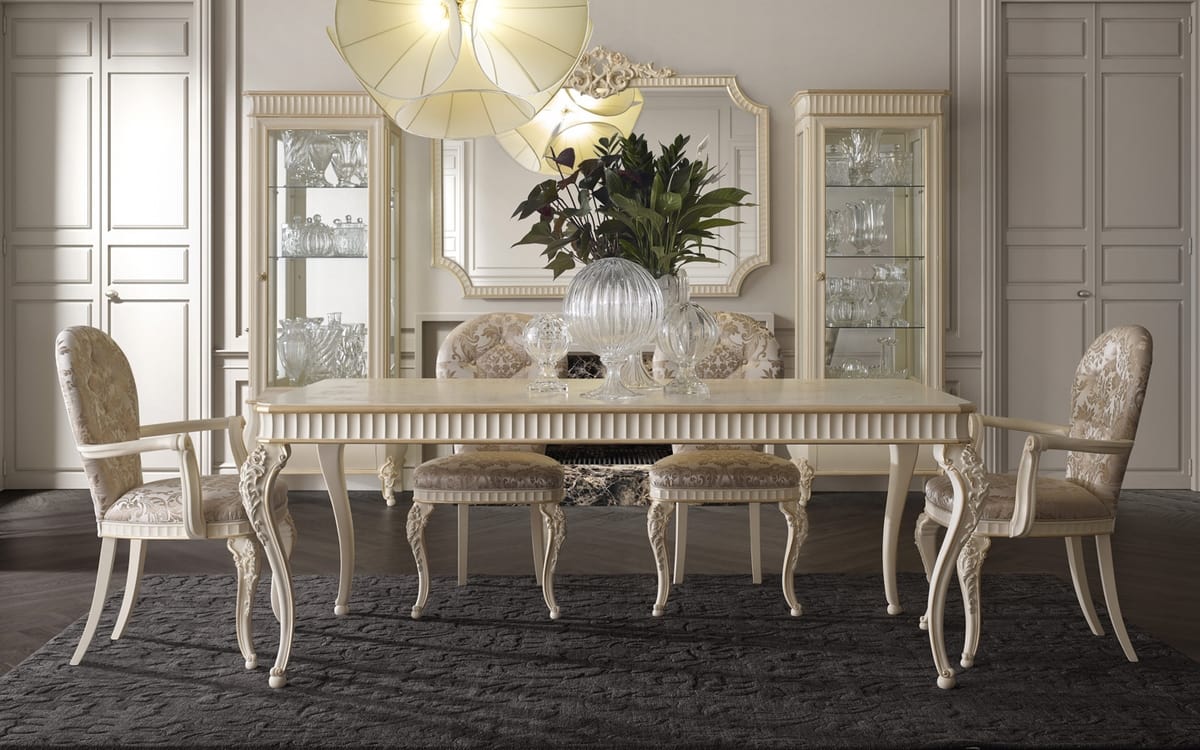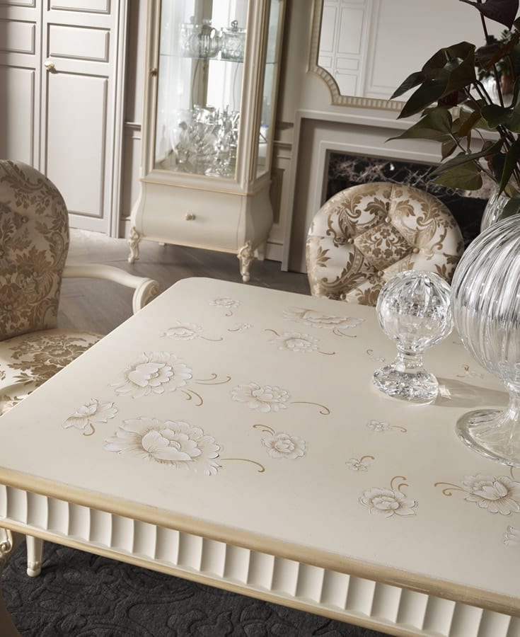 Rechteckiger Esstisch aus Holz. Klavier mit Blumendekorationen. Auch in der Version mit 4 geschnitzten Beinen erhältlich. Gold Details.