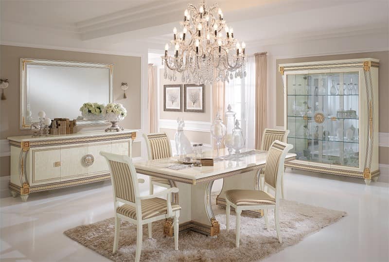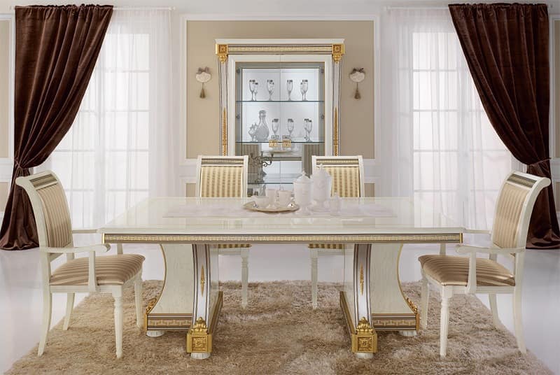 Esstisch in festen oder ausziehbaren Versionen. Hochwertige Möbel sollten immer mit dem harmonischen Design mit den praktischen Einsatz. Unsere hoch qualifizierten Handwerkern gelten mit äußerster Sorgfalt das Blattgold auf allen Ornamenten und Hauptstädten. Sie werden dann ordnungsgemäß poliert und geschützt mit einem Hochglanz-Mantel, um die Haltbarkeit in der Zeit zu gewähren.