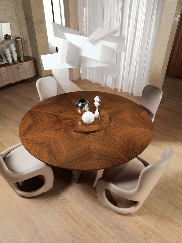 Tabelle mit lederbezogenen Holzkonstruktion in Nussbaum Details, mit runder Platte aus amerikanischem Nussbaum natur, mit Einlage. Ideal für Speiseräume in der zeitgenössischen klassischen Stil.