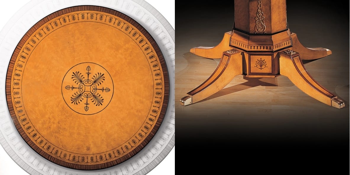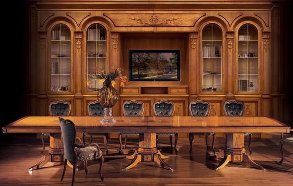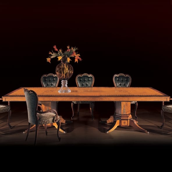 Preise anfordern Ähnliche ProdukteTisch im klassischen Stil. Hergestellt aus Myrte-Birnenholz mit Mahagoni-Inlays, in gebeiztem Kirschholz mit goldenen und schwarzen Details. In unseren Kollektionen gibt es mehrere Modelle mit eingelegten Tischen. Um unsere Gäste zum Mittagessen willkommen zu heißen, haben wir wunderschöne Luxustische geschaffen, die die Räume geschmackvoll dekorieren. Die zahlreichen, in Bellotti Ezio eingelegten Tischmodelle werden in verschiedenen Größen reproduziert und harmonisch in die verschiedenen Speisesäle oder Besprechungsräume eingefügt. Wir bieten Räume, die immer mit Vitrine, Sideboard und TV-Schrank ausgestattet sind. Am Tisch können Sie viele Stühle kombinieren, für die Polsterung eine große Auswahl an luxuriösen Stoffen zur Auswahl steht.