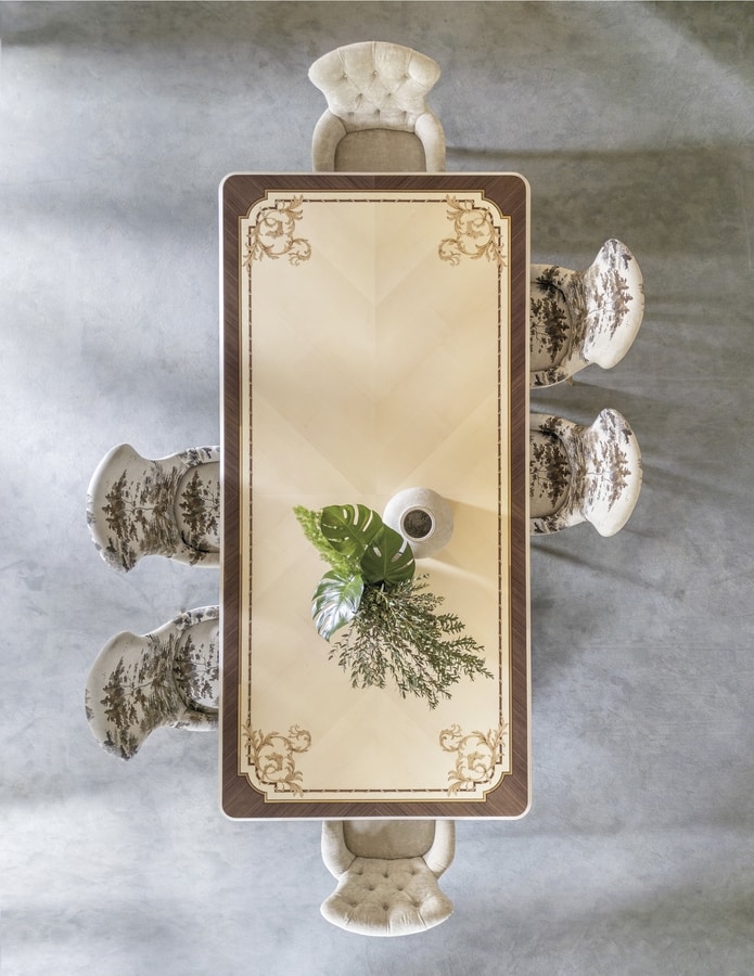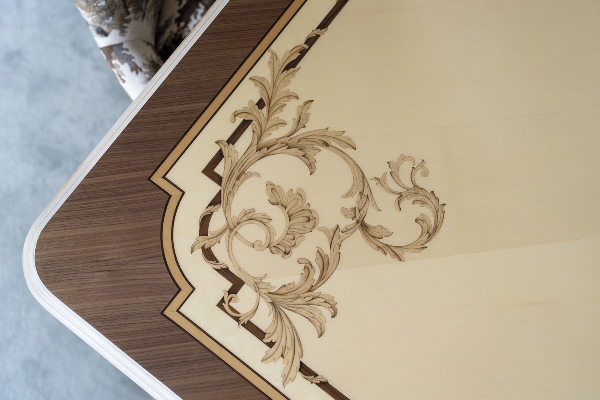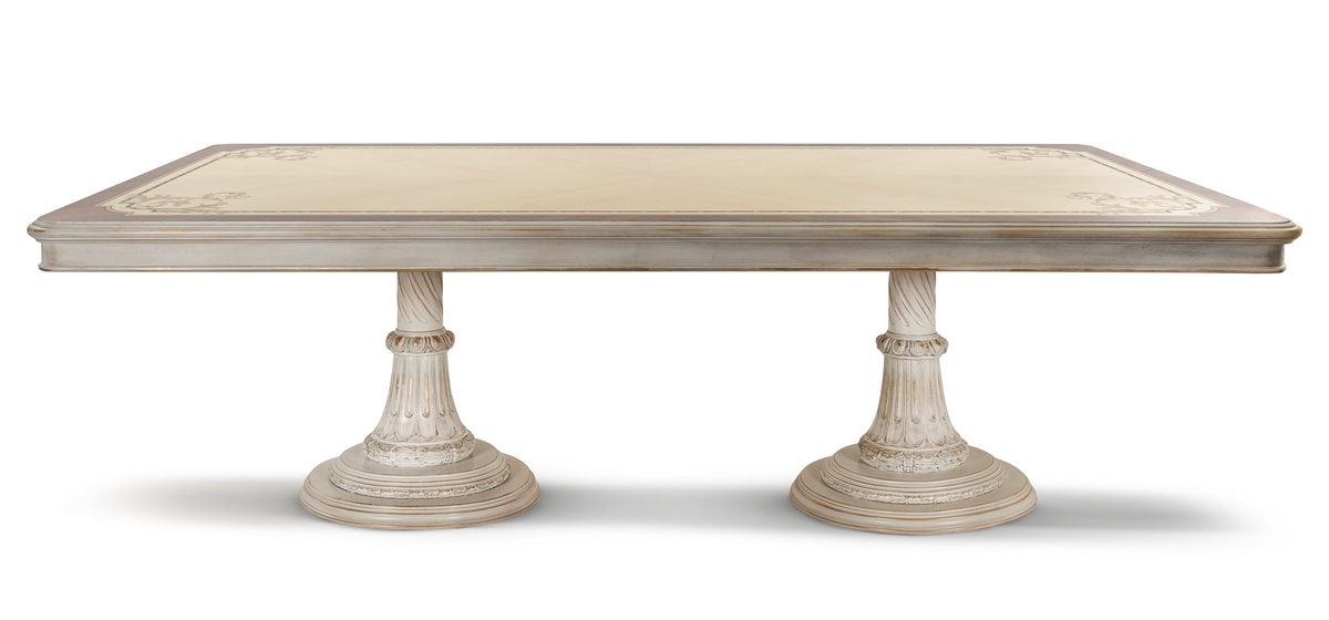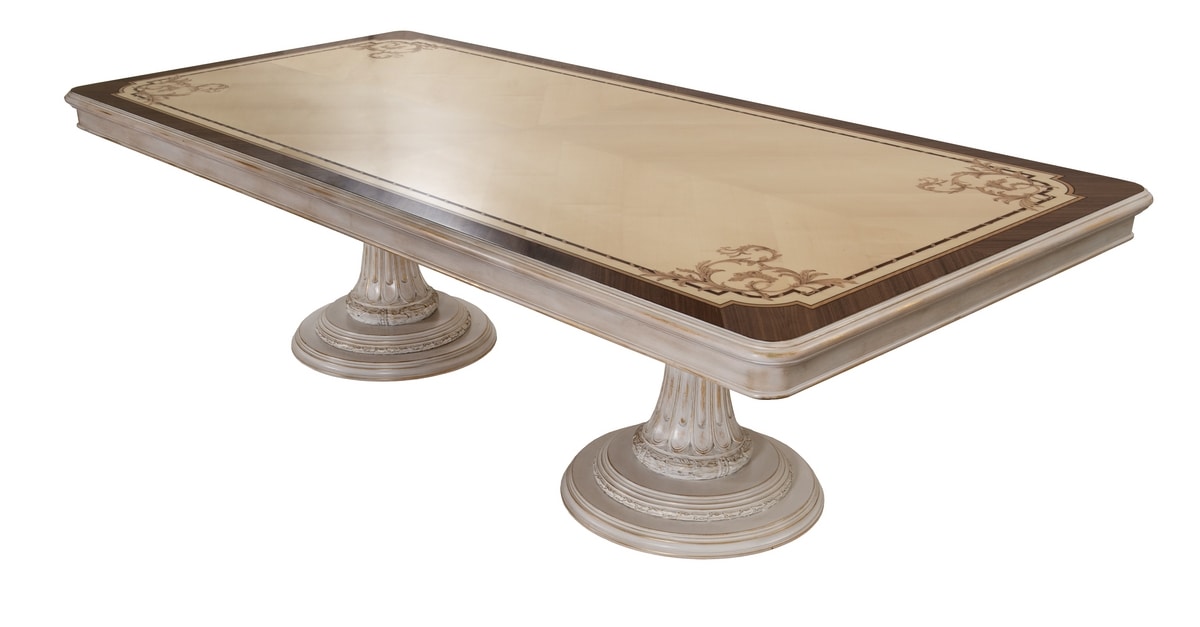 Esstisch mit zwei zentral geschnitzten Holzbasen, die in LAFM fertiggestellt wurden - Destressed French Tempera Lack in Baiser weiß über Blattgold. Das Oberteil kombiniert Maple, Canaletto Walnut und erable, angereichert mit Pearwood Inlay und einem dekorativen Marquetry -Motiv in Rosenholz mit schattigen Birnen- und Walnussblättern. Ein Meisterwerk der klassischen Schrankherstellung für raffinierte Innenräume.