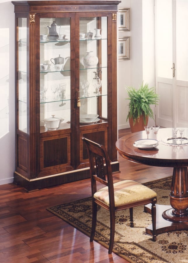 Intarsienvitrine aus Walnussholz. Geeignet für klassische Esszimmer. Interne Glasregale.