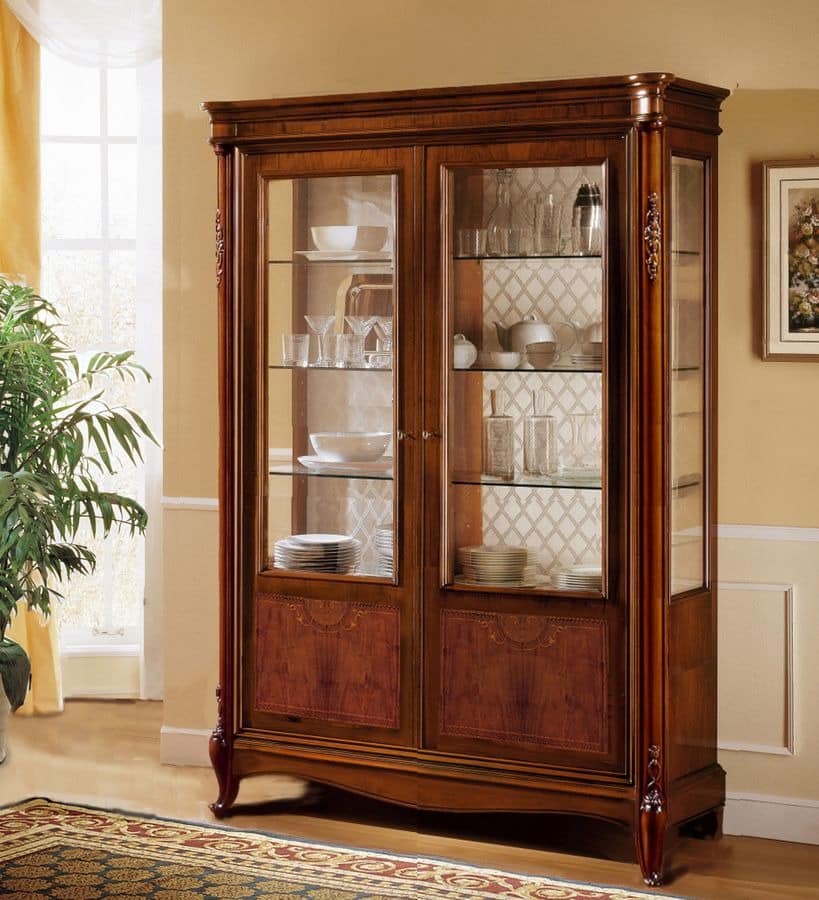 Klassische Nussbaum Vitrine mit 2 Türen zum Speisesaal. Massivholz Details Hand gearbeitet verbesserte mit wertvollen Intarsien in Naturholz. Auch mit 3 Türen, Schubladen und Blattgold Details.