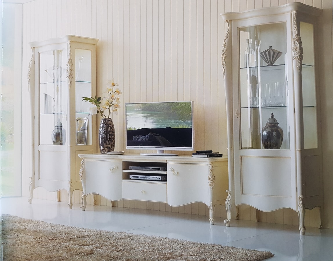 Klassische Vitrine mit 1 geriffelten Haustür mit Einlegearbeiten in weiß lackiertem Lack.