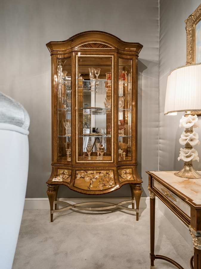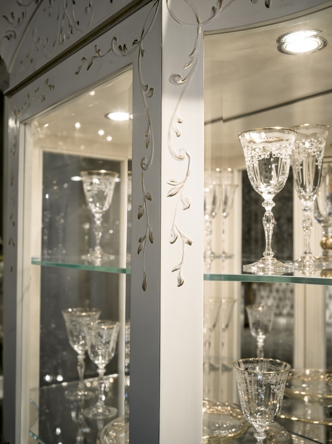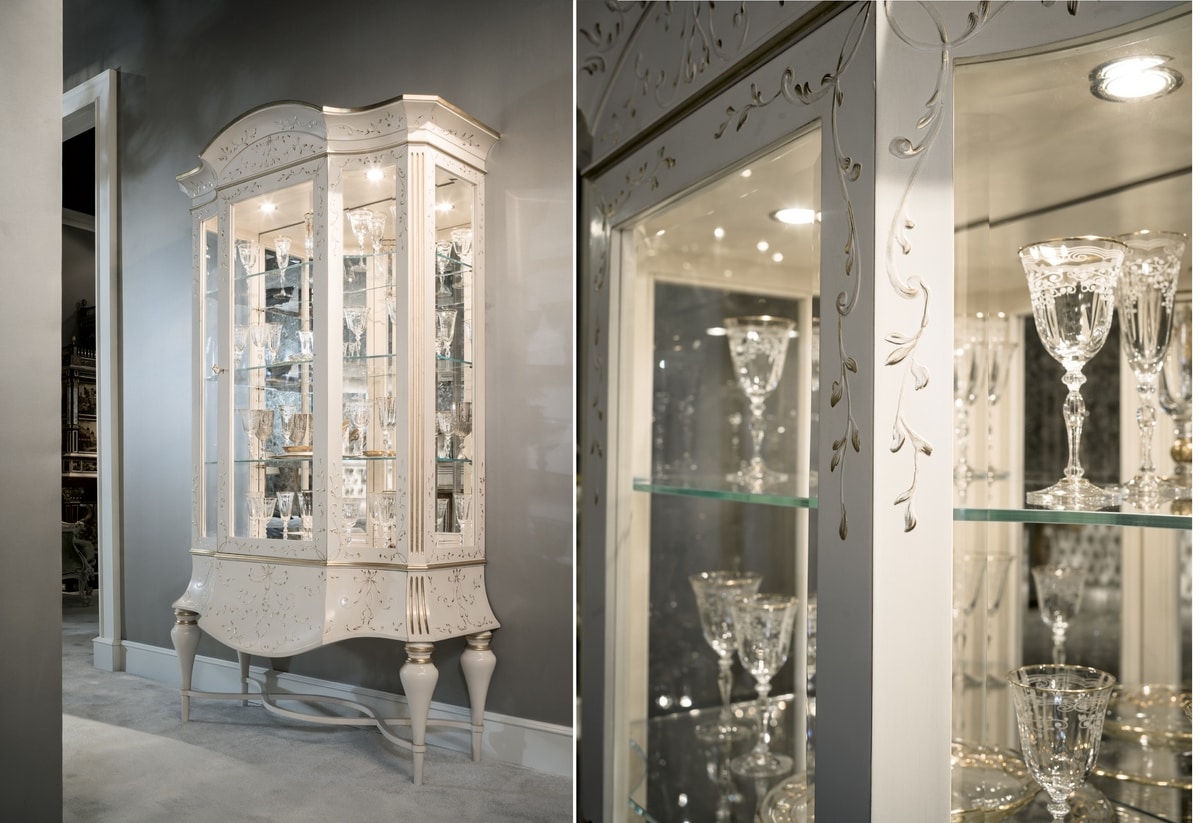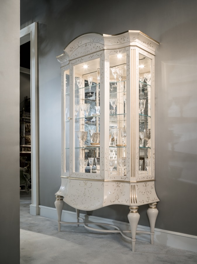 Luxus klassisches Schaufenster. Vitrine 1 Tür, verziert mit einem Reliefpinsel aus Gips in leicht patinierter Elfenbeinfarbe, mit knisternden Verzierungen in Blattgold. Die besondere Verarbeitung macht es zu einem wertvollen Stück, seine Feinheit passt es an die elegantesten und prestigeträchtigsten Umgebungen an.