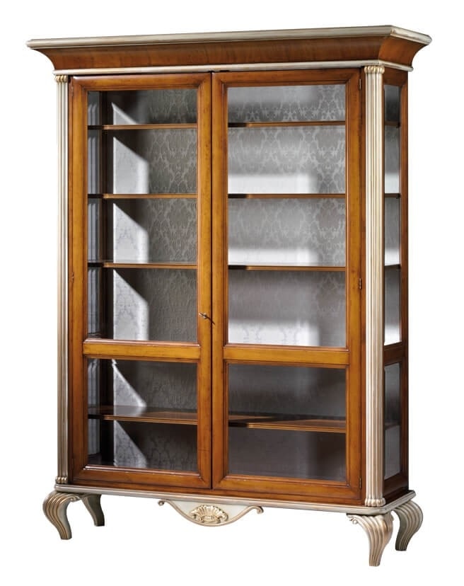 Nussbaum-Vitrine mit Glastüren mit Fischgrät-Intarsien. Fünf Holzböden und Rückwand mit elegantem weißem Stoff bezogen. Die Oberseite wird von einem geformten Gesims in Nussbaum im Schritt gebildet, während die Vorderseite von zwei geschnitzten Säulen mit Rillen getragen wird, die die schlanke Form hervorheben und sich entlang der Kurve der vier Füße fortsetzen. Zwischen den Füßen befindet sich eine geformte Schürze mit fächerförmigen Schnitzdetail. Auf dem Foto Nussbaumholz getönt und patiniert (Code: MI01), goldlackierte Akzente mit Elfenbeinnuance (Code: Oro sfumato avorio), leicht beunruhigend.