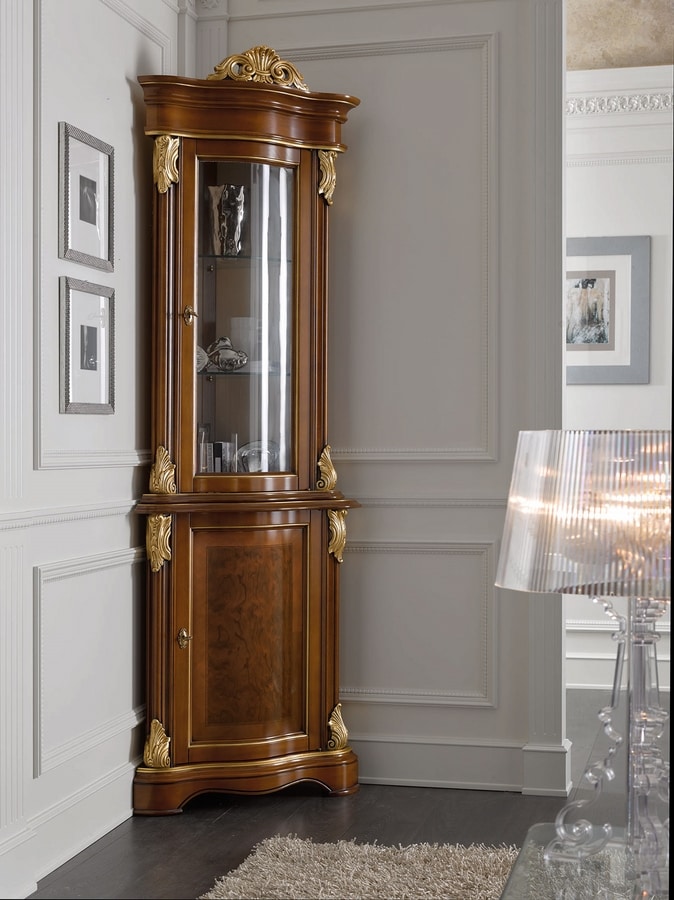 Eckschrank im klassischen Stil, mit Briarfront. Schnitzereien aus Blattgold. Interne Glasböden.