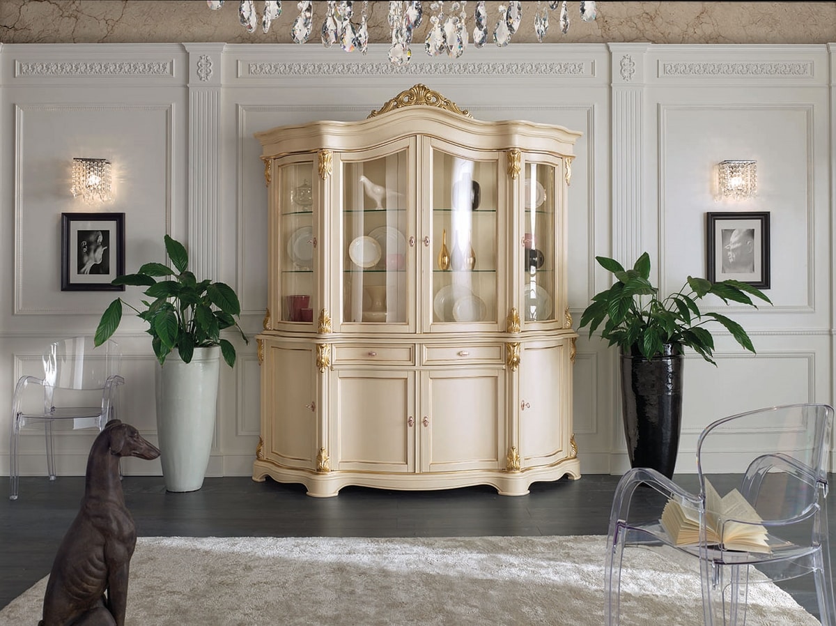 Glasschrank aus lackiertem Holz. Interne Glasböden. Blattgold Details. Mit 2 Schubladen.