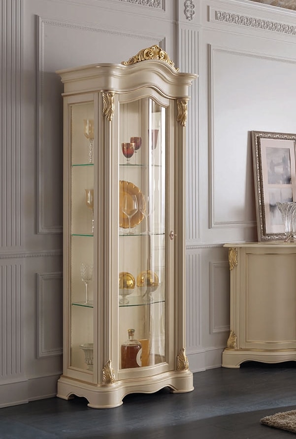 Vitrine mit 1 Tür, ganz aus Glas, mit goldgeschnitzten Verzierungen. Interne Glasböden.