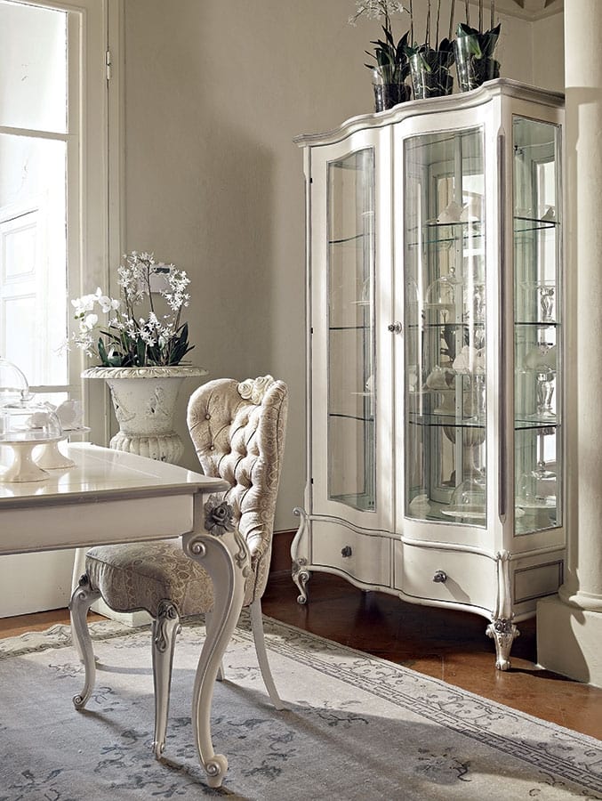 Klassischer Vitrinenschrank mit weißem und silbernem Finish. Ausgestattet mit zwei Schubladen mit blumenförmigen Knöpfen. Interne Glasregale.