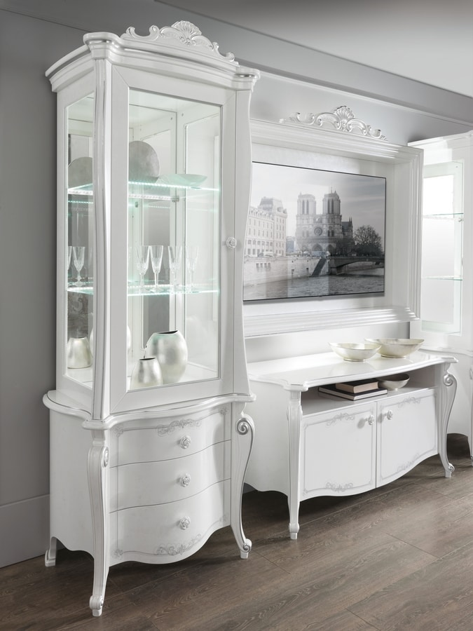 1-türige Vitrine aus weißem Perlmutt mit Zierleiste (auch ohne Zylinderleiste erhältlich). Mit 3-Schubladen-Boden.
