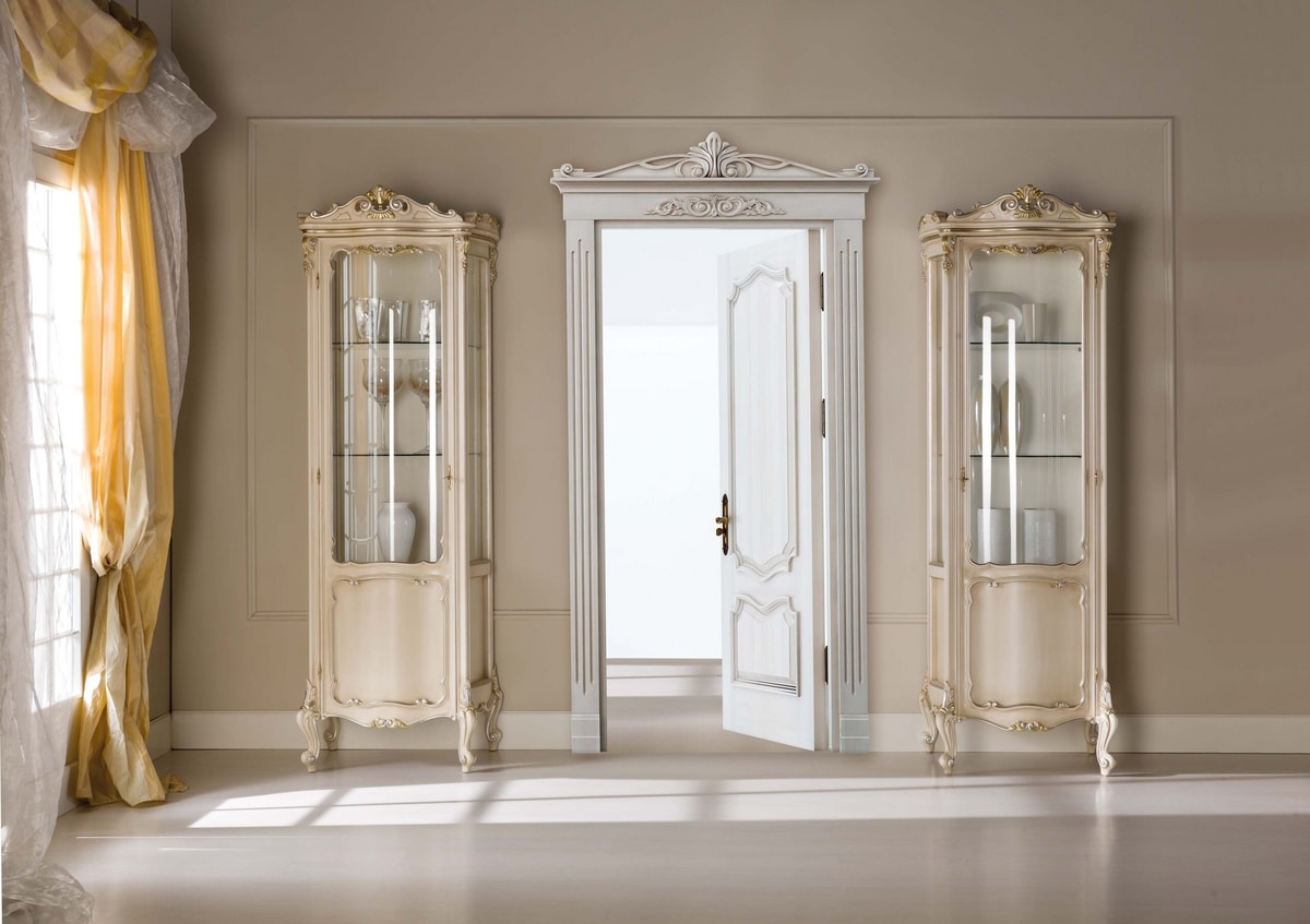 Klassische Vitrine aus geschnitztem und lackiertem Holz. Glasböden. Details in Blattsilber.