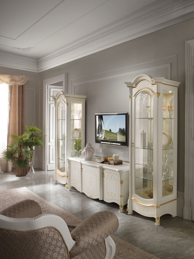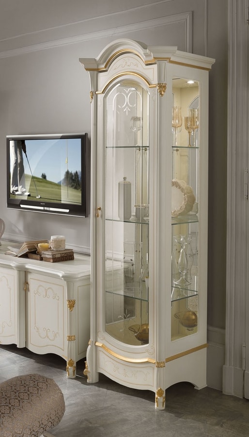 Vitrine mit 1 rechten / linken Tür, Kit-Leuchten inklusive, Glasböden, Spiegelrückseite, gravierte Glasfronten.