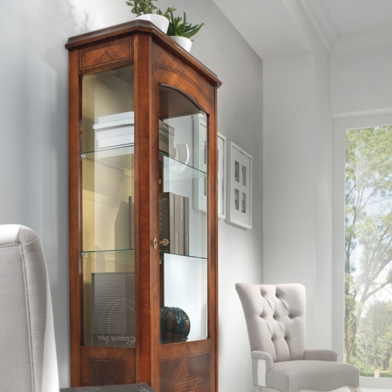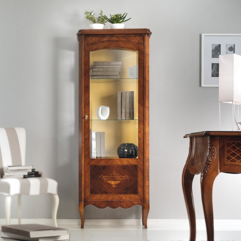 Preise anfordern Ähnliche ProdukteEintürige Vitrine mit Glasseiten. Eine Einlage aus weißem Ahorn, die eine Tasse nachbildet, schmückt die Tür. Leicht geformte Beine, die sich auf einem mehrvolutenigen Band fortsetzen. Einzigartige Werke, die mit alten Techniken geschaffen wurden und die Meisterschaft von der Vergangenheit bis in die Gegenwart übertragen.