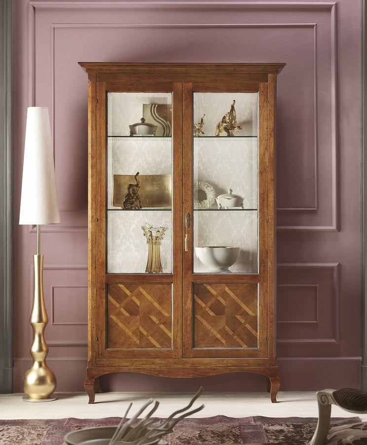 Vitrine mit 2 eingelegten Türen und Glasböden.