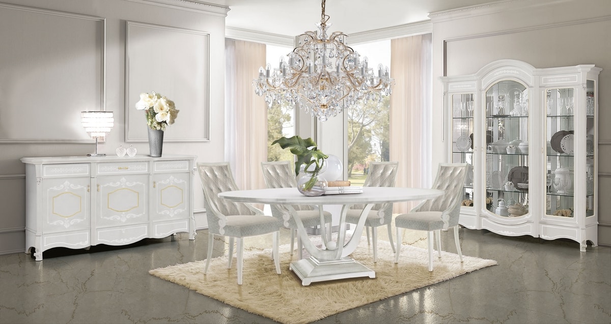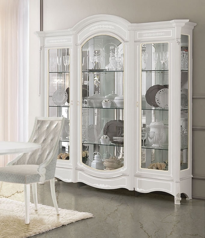 Vitrine mit 3 Türen, Beleuchtungsset inklusive, Glasböden, Spiegelrückseite, graviertes Frontglas.