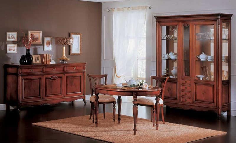 Klassischer Vitrinenschrank aus Walnussholz für Speisesäle. 3 Türen und 4 Schubladen. Schnitzereien und Intarsien vollständig von Hand auf Massivholz. Wachs Finish. Alle Arbeit ist streng handgemacht und produziert in Italien Italia. In Brianza gemacht-Made. Auch mit Blattgold oder Blattsilber Details.