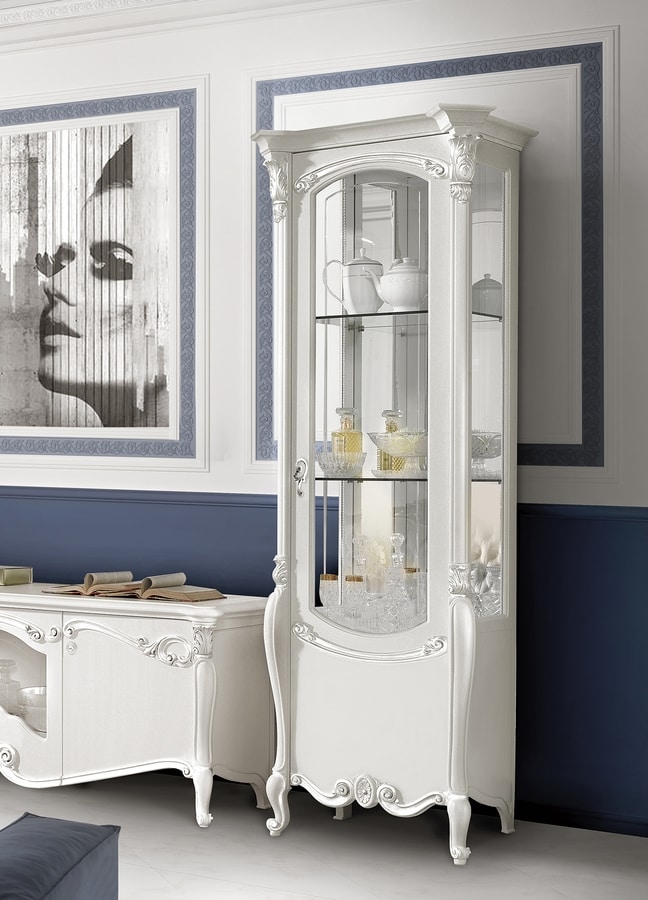 Elegante Vitrine mit einer Tür aus lackiertem Holz. Interne Glasböden. Lichtset enthalten.