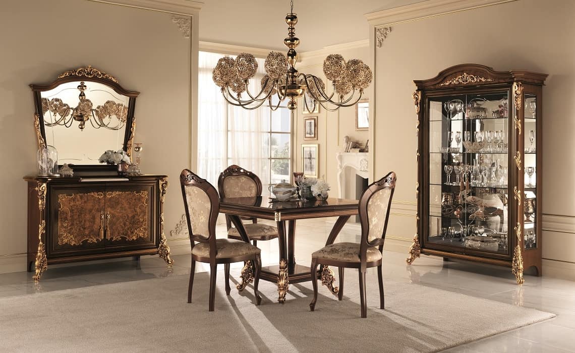 Die Sinfonia Sammlung Esszimmer ist mit einem eleganten Dynamik geprägt. Jedes Einrichtungsstück ist eine Schöpfung entworfen, den Wert der italienischen klassischen Design zum Ausdruck bringen gipfelte dekorativ mit dem Barock. In einer Hommage an die theatralische Verschmelzung von siebzehnten Jahrhundert Form und Farbe, das goldene Zeitalter der italienischen dekorative Tradition, die Tabelle unterstützt, Spiegelblenden und ergänzende Türen sind mit floralen Vergoldung und gewundenen Spiralen verziert. Timeless Klassenstil.