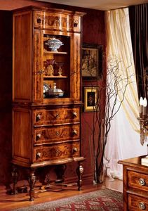 Vitrinen in Nussbaum, mit einem mittleren Tür, 3 Schubladen, Rücken aus Stoff, Kristallregalen bedeckt, für Umgebungen in klassischen Luxus-Stil