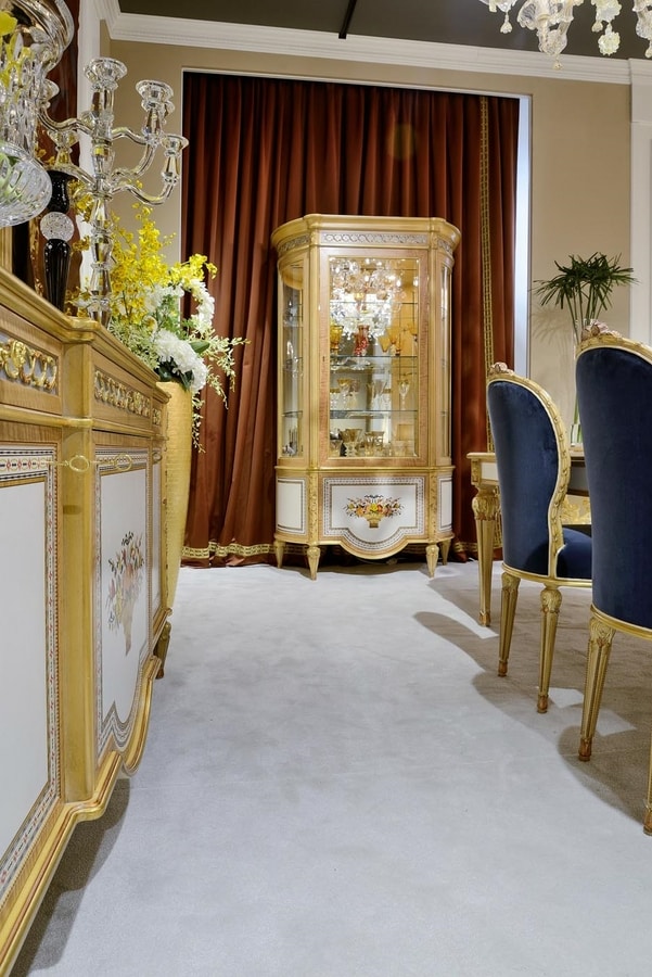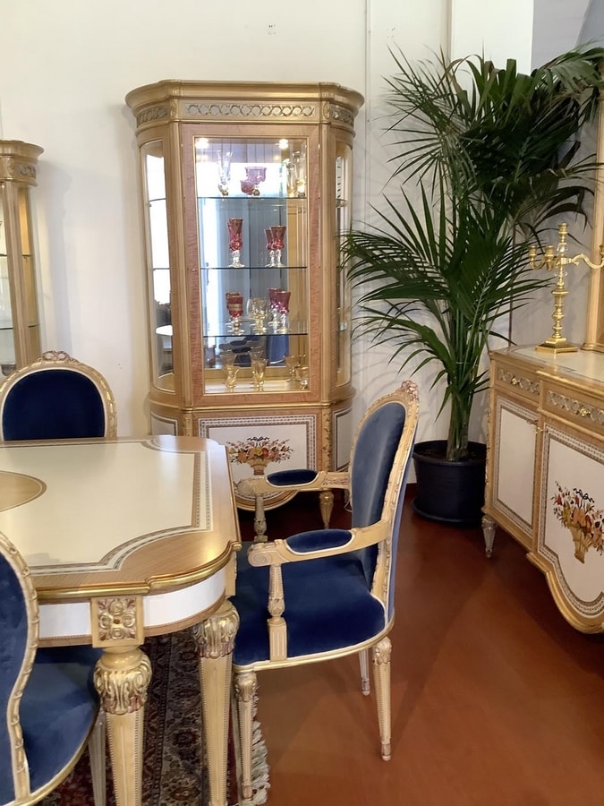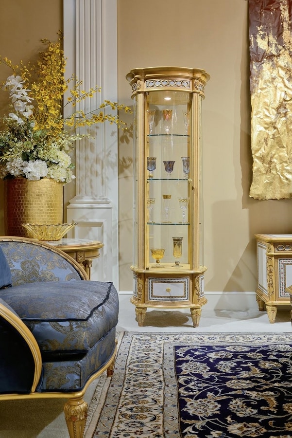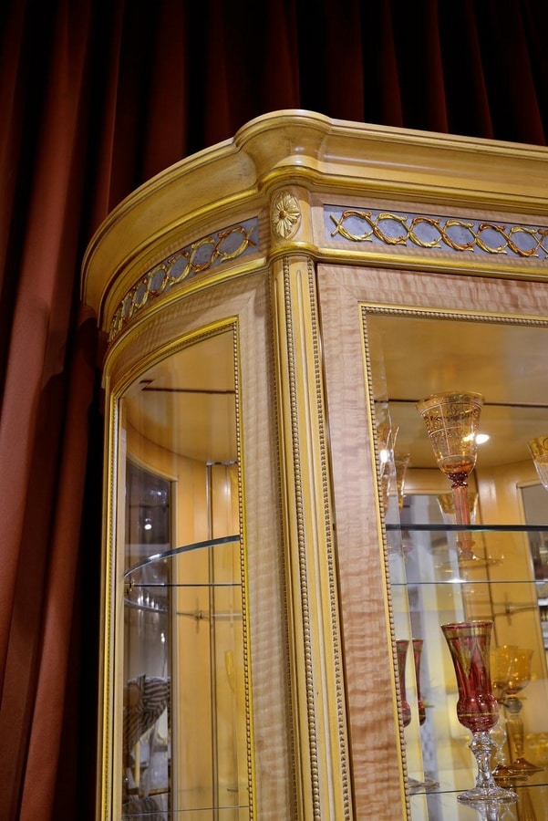 Preise anfordern Ähnliche ProdukteVitrinen im klassischen Stil von Louis XVI. Hell und elegant möblieren sie das Wohnzimmer und den Essbereich, kombiniert mit dem TV-Ständer, dem Tisch und dem Schrank. Voll von geschnitzten Details in Decapè-Finish mit Gold- und Bronzetönen. Die für diese Kollektion typischen, von geometrischen Motiven eingerahmten, leicht erbaubaren Platten werden auch im unteren Teil der Schränke vorgeschlagen. Für den zweitürigen Vitrinenschrank finden wir die farbenfrohen floralen Einlagen, die für das Schlafzimmer verwendet werden. Diese Kollektion wurde für die 360 ° -Einrichtung von Eigenheimen entworfen. Tatsächlich finden wir den gleichen Stil für das Schlafzimmer, das Esszimmer und das Wohnzimmer. Auf Wunsch auch für die Küche!