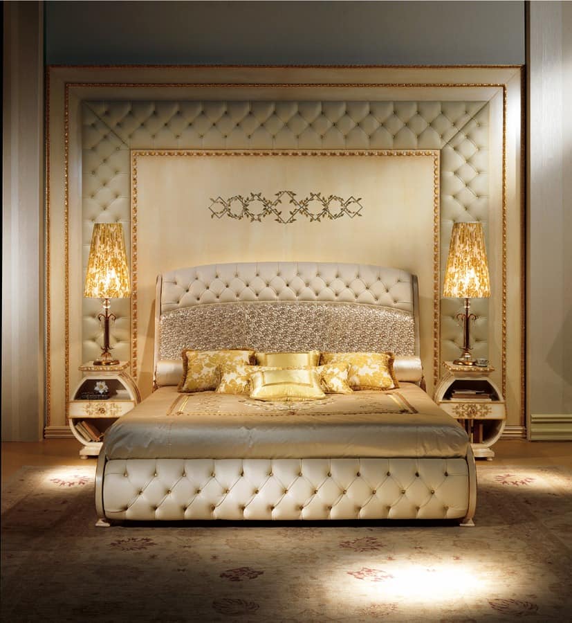 Boiserie aus lackiertem Holz mit Reliefschmuck in Blattgold überzogen. Lederband mit capitonné Arbeit. Auf Wunsch können die Größen und Farben der boiserie sowohl in der Nacht-und Wohnbereich variiert werden und es verwendet werden kann.