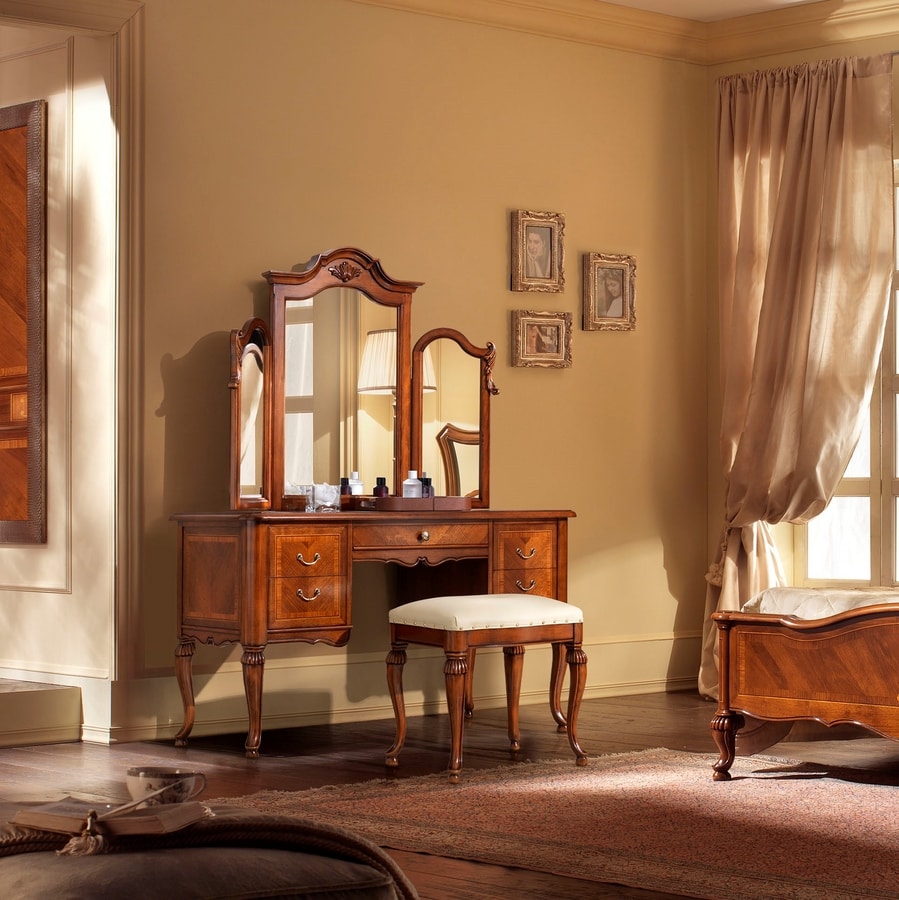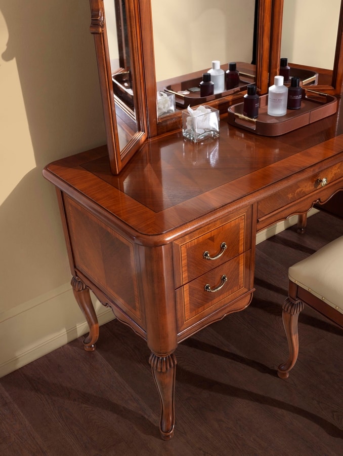 Handgefertigter Schminktisch im klassischen Stil aus Walnussholz mit handgefertigten Intarsien und Schnitzereien, 5 Schubladen, am Schminktisch verankerter Spiegel.