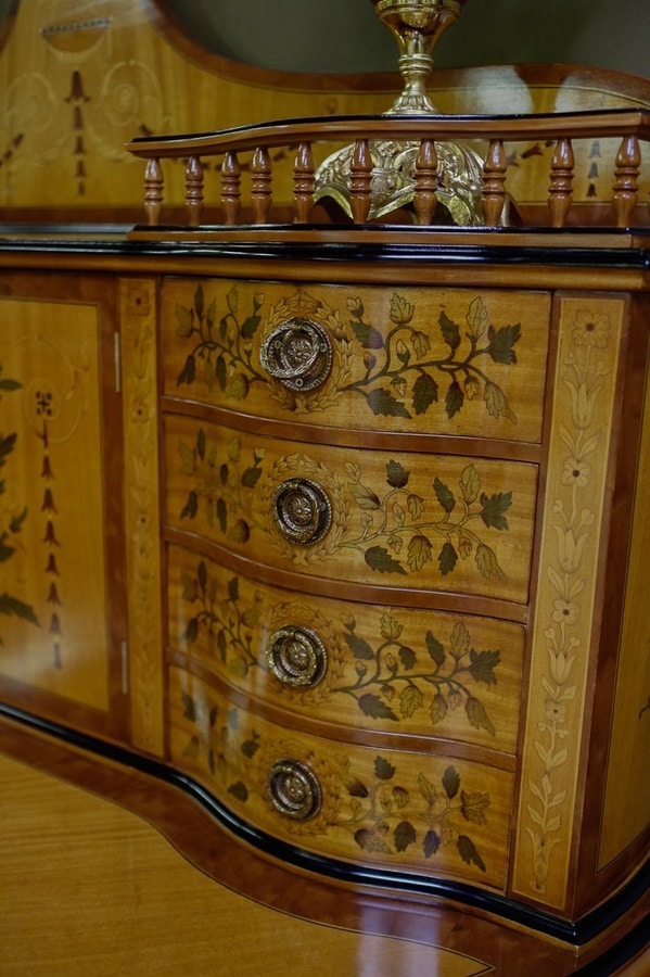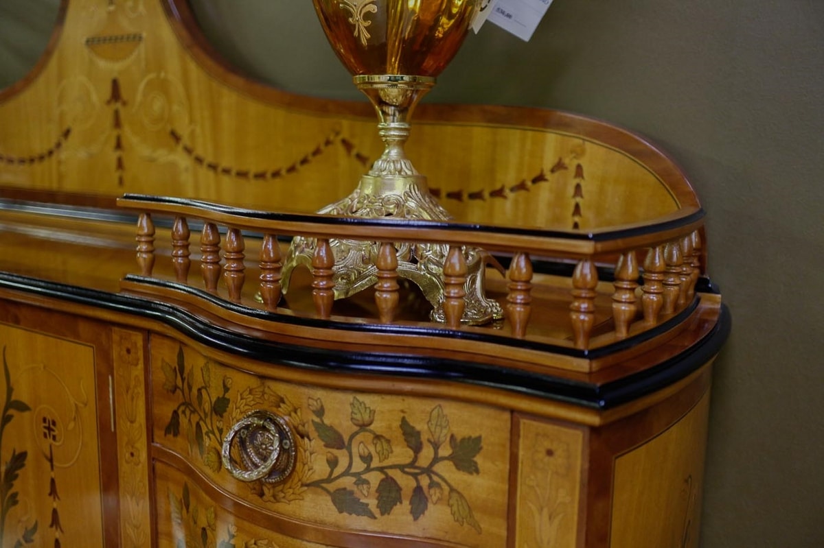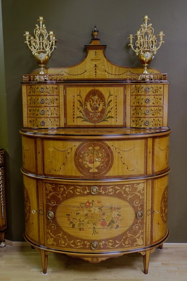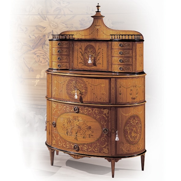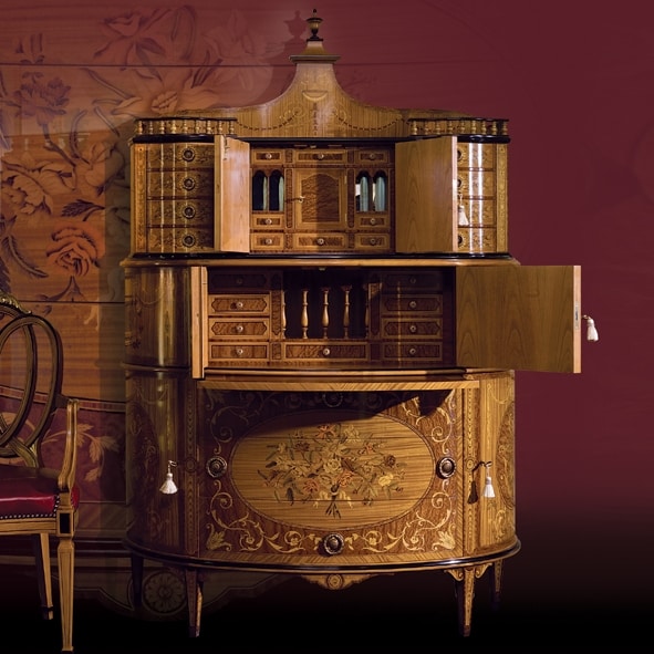 Schrank im Maggiolini-Stil mit eingelegtem Zitronen- und Pomelé-Briarholz. Es ist inspiriert von den aufwändigen Inlays, die gegen Ende des 18. und Anfang des 19. Jahrhunderts vom berühmten italienischen Tischler Giuseppe Maggiolini hergestellt wurden. Der Maggiolini-Stil ist seit jeher gefragt und von großer Wirkung für seine reichhaltigen Einlegearbeiten, die von erfahrenen Tischlern ausgeführt werden. Die gleichen geschwungenen Linien finden Sie in Raum 3460. Dieses Stück kann tatsächlich nicht nur in den Fluren, sondern auch im Schlafzimmer als Sekretär verwendet werden.