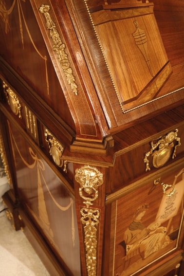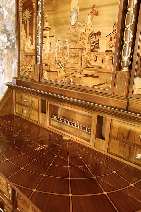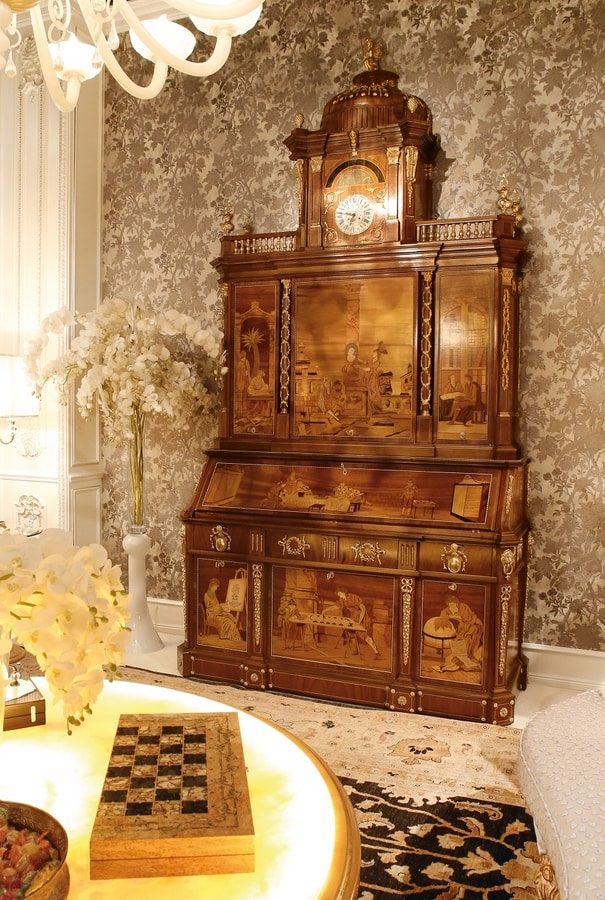 Preise anfordern Ähnliche ProdukteSchrank im "David Roentgen" -Stil mit Sekretär, mechanischer Uhr und Bronzestatue. Sehr reich an Inlays und externen Arbeiten, enthält es auch zahlreiche interne Mechanismen, Schubladen und kleine Schubladen. Dies macht es zu einem Stück, das sich majestätischen Salons und luxuriösen privaten Lounges anpasst. Bellotti Ezio Arredamenti bietet eine große Auswahl dieser raffinierten und kunstvollen Stücke mit unterschiedlichen Stilen, aber für Umgebungen, die immer Luxus und Eleganz gemeinsam haben. Unser luxuriöses Einrichtungszubehör wurde geschaffen, um den verschiedenen Räumen des Hauses einen Hauch von Klasse und Originalität zu verleihen. Unsere Reproduktionen historischer Möbel finden in den Eingängen und Hallen ihren rechtmäßigen Platz. Die aufwändigen Einlegearbeiten, der höchste Ausdruck des in Italien gefertigten Möbelbaus, bereichern unsere Kreationen und machen sie raffiniert und einzigartig.