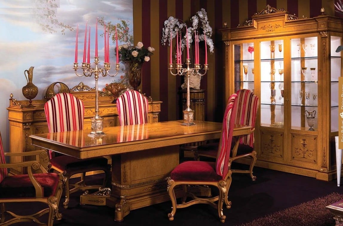 Preise anfordern Ähnliche ProdukteMöbel im klassischen Stil. Hergestellt mit drei Türen mit Schubladen im oberen Teil, in eingelegtem Bruyholz mit Amaranthfäden und goldenen Schnitzereien, in Kirschkern patiniert. Die Möbelkollektionen von Carlo X zeichnen sich durch eine geradlinige, einfachere und nüchternere Einrichtung aus, die von der kurzen historischen Zeit gewünscht wird. In dieser Zeit wurden tatsächlich viele Merkmale des vorherigen Geschmacks aufgegeben, und selbst die Einlagen, obwohl sie immer vorhanden sind, sind entschieden mehr Licht. Die von uns angebotenen Räume sind immer mit Vitrinenschrank, Sideboard, Tisch und Stühlen ausgestattet.