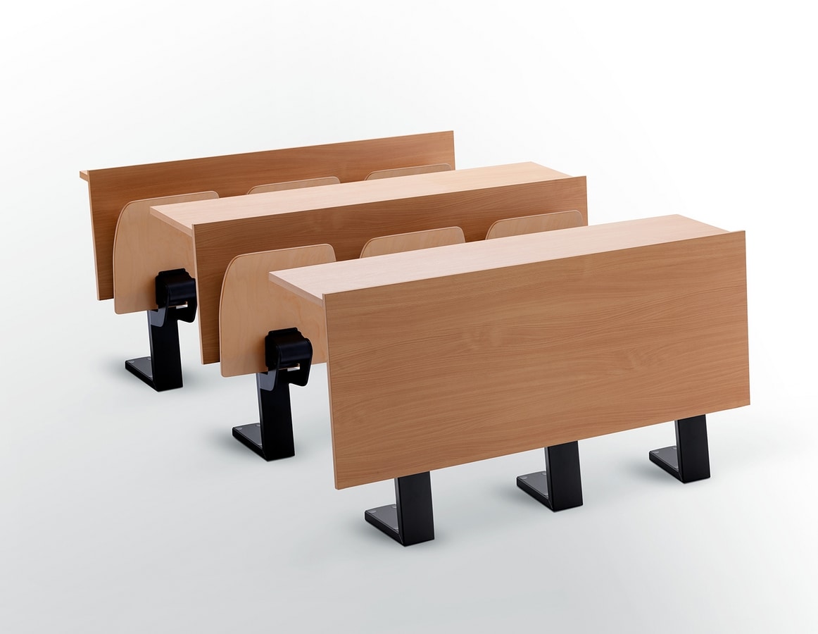 Sitz und Rückenlehne aus lackiertem Buchensperrholz oder gepolstert und gepolstert (Stoff oder Öko-Leder). Stützstruktur lackiert RAL 9006, Sitzklappmechanismus lackiert RAL 9006 mit interner Rückstellfeder. Zentrale Stütze und Befestigungsfuß für jeden Sitz. Befestigung am Boden ohne sichtbare Schrauben Feste oder panikhemmende Schreibfläche aus melaminbeschichtetem Holz.