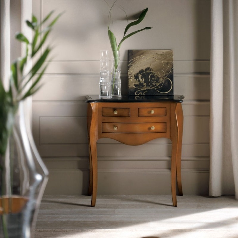 Preise anfordern Ähnliche ProdukteKonsole mit drei Schubladen, einer großen und zwei kleineren, die auf der Vorderseite mit schwarzer Oberseite einen besonderen ästhetischen Effekt erzielen. Konsole in Walnuss-Finish. Möbel mit starker klassischer Inspiration, aber mit der für zeitgenössische Möbel typischen Raffinesse und formalen Sauberkeit. Perfekt für zeitgemäße und elegante Einrichtungsgegenstände, gedacht für diejenigen, die sich von flachen und eintönigen modernen Lösungen abheben möchten.