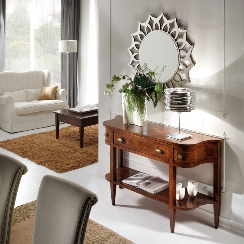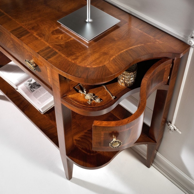 Preise anfordern Ähnliche ProdukteGeformte Konsole mit einer Schublade und zwei seitlichen offenen Fächern, die durch geformte Türen verschlossen sind. Die eingelegten Filets umschließen in ihrem Inneren eine wunderschöne Walnussfeder. Schultern und Beine sind mit feinem Furnier verziert und enden in einer Spitze, die ein Regal trägt, das wie die Hauptplatte gefertigt ist. Einzigartige Werke, die mit alten Techniken geschaffen wurden und die Meisterschaft von der Vergangenheit bis in die Gegenwart übertragen.