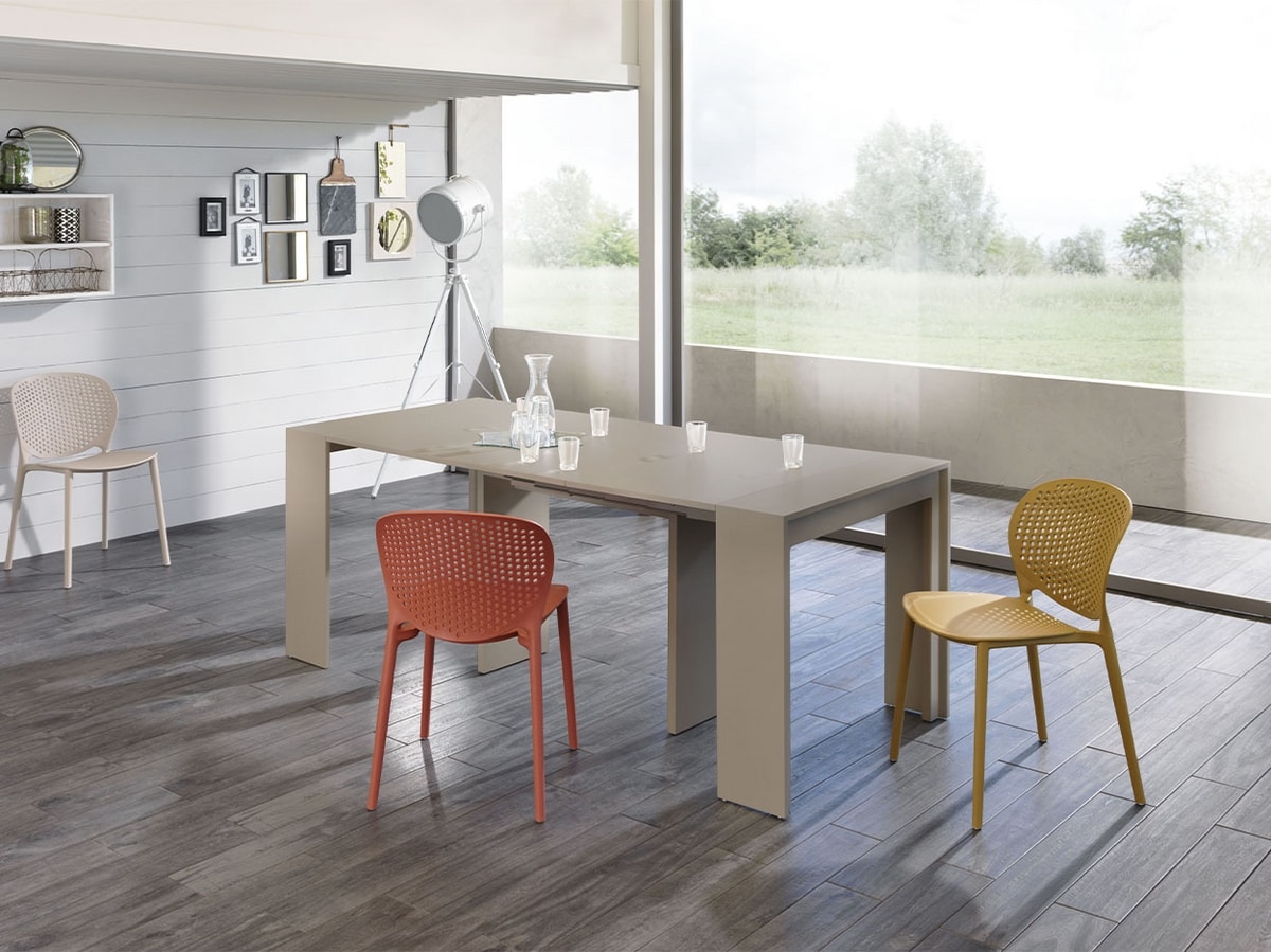 Preise anfordern Ähnliche ProdukteDie ausziehbare rechteckige Konsole, vollständig aus lackiertem MDF gefertigt, ist in den Versionen Mattweiß, Mattgrau, Mattschwarz und Matttaupe erhältlich. Er verfügt über 5 Verlängerungen mit einer Länge von jeweils 52 cm, die in einem speziellen Behälter aufbewahrt werden, und ein neigbares Mittelbein für die offene Tischkonfiguration.