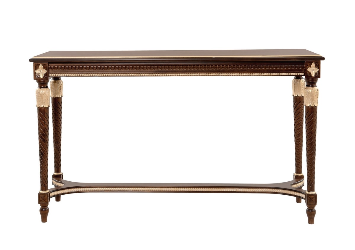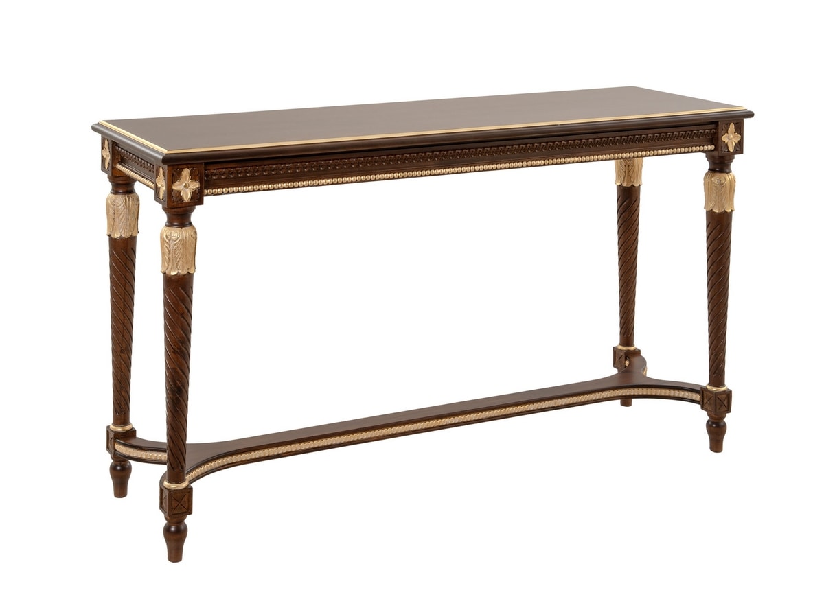 Konsole mit Holzplatte, geschnitzter Holzsockel, Ausführung NP5 in mattem Walnussholz mit patiniertem weißem Baiser aus Blattgold.
