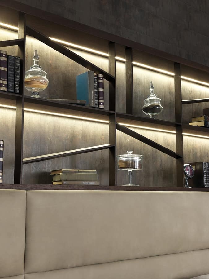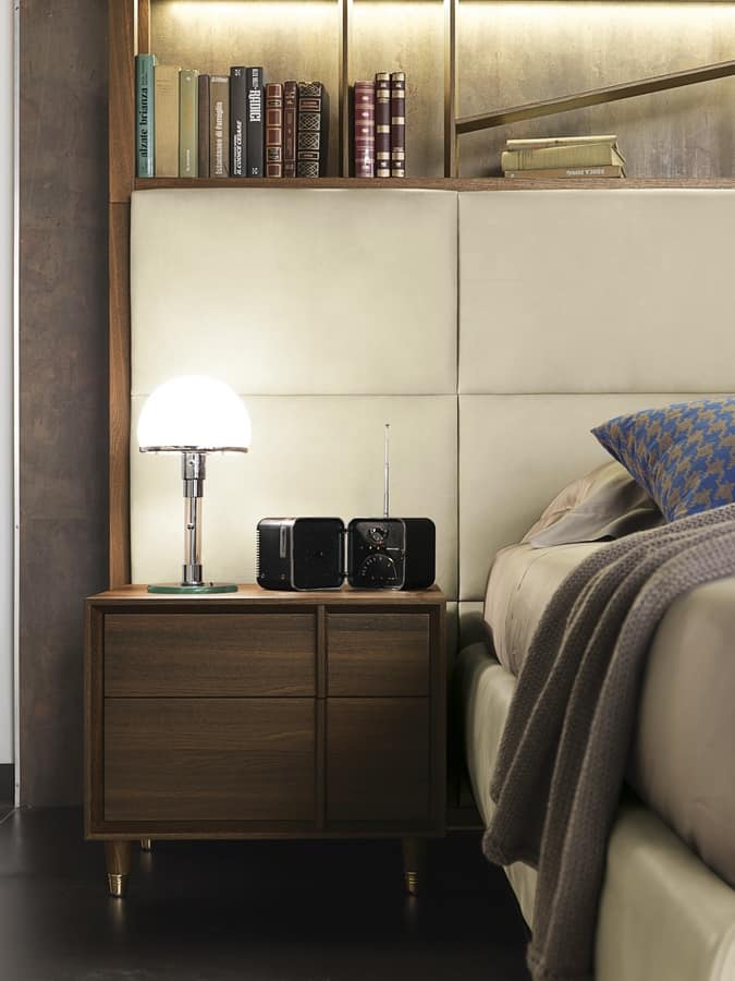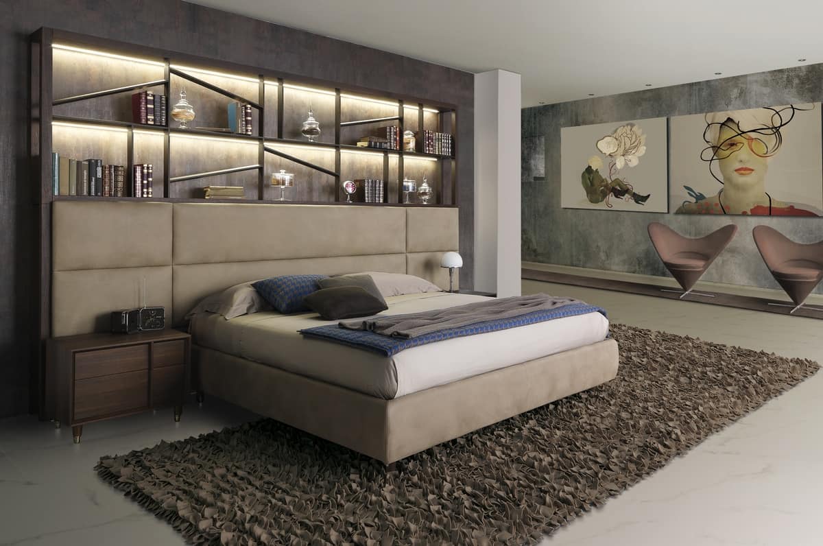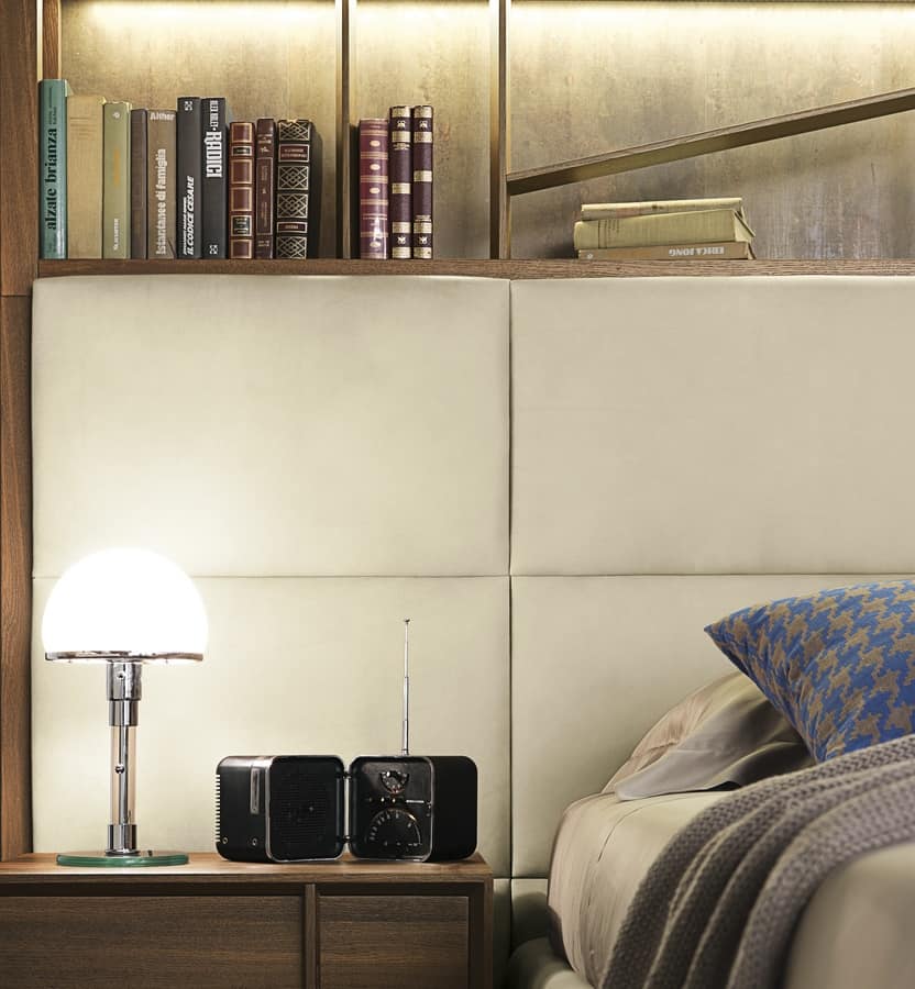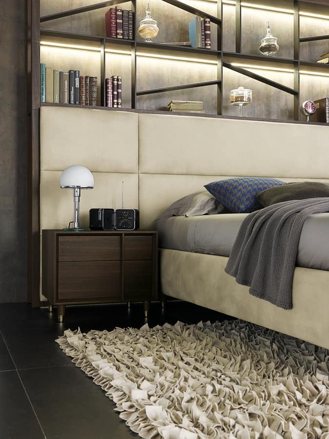 Geprägt durch einen Hochreliefgriff, extrahiert aus Massivholz, oben 45 ° seitlich. Terminalteil in Gold / Metall mit Anti-Rutsch-Schutz für Boden. Bett Bücherregal ist als "Skulptur Bett", in Massivholz, und es ist handgefertigt mit Diagonalen und Kreuze mit zwei breiten Regalen mit Led-Leuchten mit einer indipendent Touch-Steuerung erstellt und konzipiert. Erhältlich in verschiedenen Ausführungen und mit Kopfteil aus Stoff, Leder oder Simil Leder.